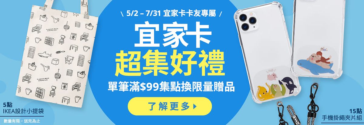 夏天就是該出門玩的季節!IKEA超「集」好禮活動開跑,推出專屬設計好物讓你隨身帶著走、輕鬆出遊去!5/2至7/31活動期間內,集滿5點可帶走超Q插畫的IKEA設計小提袋,集滿15點可把印有鯊鯊等人氣玩偶圖案的手機掛繩夾片組帶回家,兩款式隨心搭配超實用,讓日常生活更有型,隨手集點、輕鬆換好禮!贈品數量有限換完為止,詳情請見IKEA官網 (https://www.ikea.com.tw/zh/campaign/point-collection)。