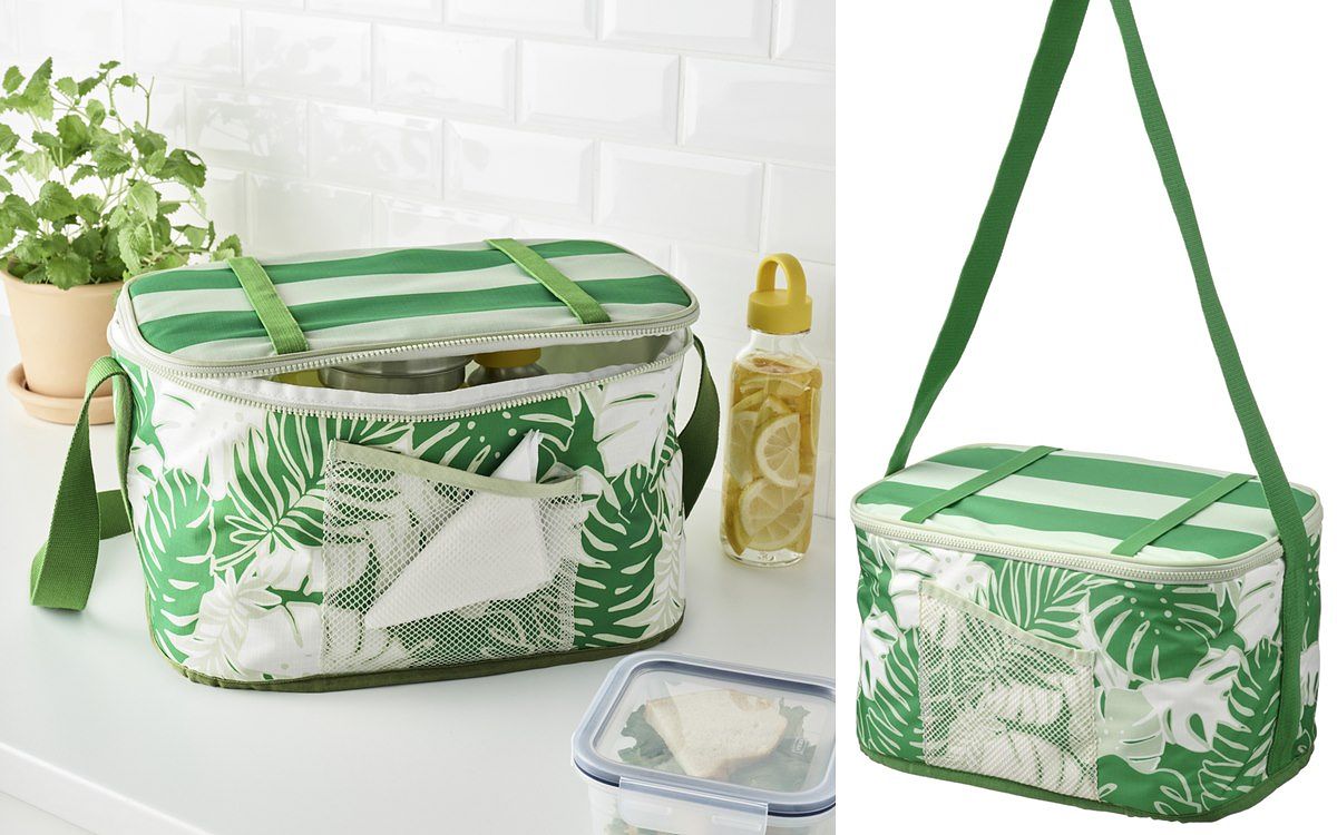 新品SOMMARFLOX保冷袋具有大面積的葉子圖案,為野餐或海邊之旅增添清新氛圍,絕緣設計可讓食物、水果、飲品隨時保持低溫狀態,前方小網袋能放入餐巾紙或濕紙巾,上蓋擁有收納帶,可簡單收納開瓶器、刀叉等用具,搭配可調整式肩帶,手提或肩背都方便。