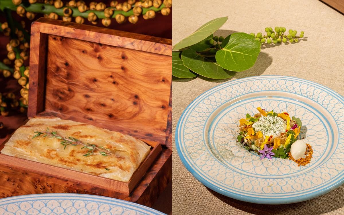 塔吉鍋(Tangia)起源於柏柏爾文化,意指「陶皿」或「煎鍋」。特殊形貌,讓食材細火慢燉下仍保軟嫩多汁,常見於水源稀缺的沙漠地區,更是摩洛哥風行數世紀的料理。為重現當地柴火上燉煮所帶來的煙燻風味,探險家主廚選用木屑煙烤羊里肌及羊肩冷燻多日、再以豐富膠質及辛香風味的羊筋高湯小火慢燉兩日直至淬鍊出豐富底蘊的獨特滋味。