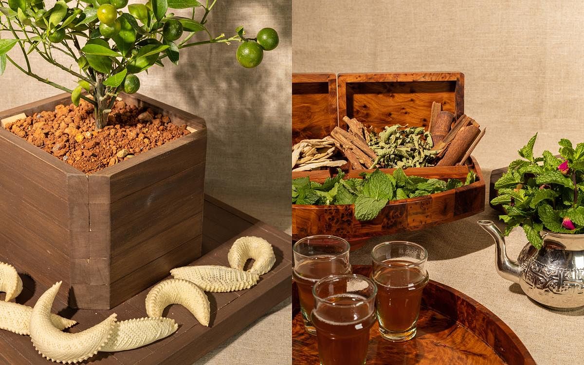 起源於18世紀,當時只有皇室貴族才有資格飲用,如今則成為了摩洛哥國民飲品。對於當地人來說,薄荷茶也象徵著滿腔的愛意以及「好事發生」。透過玫瑰、人參、薑片等乾燥香料與滿滿新鮮薄荷一起放入銀壺泡開,三次反覆沖泡並於盛倒之時拉高茶壺,讓每一滴落的薄荷茶精準倒入透明玻璃杯。淡淡茶香,清涼尾韻在喉中無限回甘,表達摩洛哥之旅終篇的蕩氣迴腸。