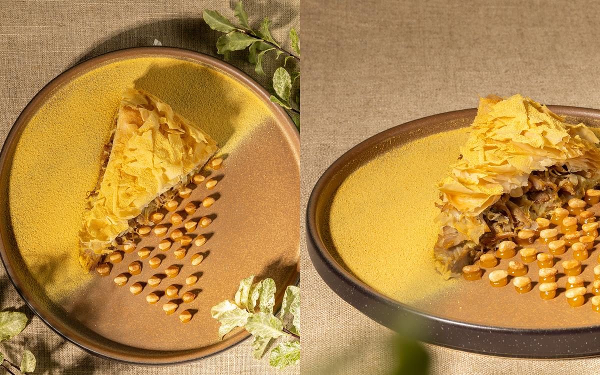 徐徐柑橘風越過地中海,吹向摩洛哥。與西班牙隔著海峽遙望,摩洛哥料理鍾愛的酸與甜源起於盛產柑橘的地中海地區。摩洛哥傳統料理- 巴斯提拉 (Bastilla) 多使用鴿子肉, 廚藝總監 James 將摩洛哥柑橘調性與台灣在地食材融入此道料理。薄脆酥皮 包覆肉質豐潤、油質豐富的橙醃櫻桃鴨腿,鋪上以牛油和百里香煎烤至金黃的朝鮮薊、撒上杏仁碎片增添香氣口感。盤上工整點綴柑橘果醬及柑橘糖粉,猶如摩洛哥磚瓦上的幾何圖形,視覺到舌尖的細膩呈現,一場感官盛宴口中盛開。