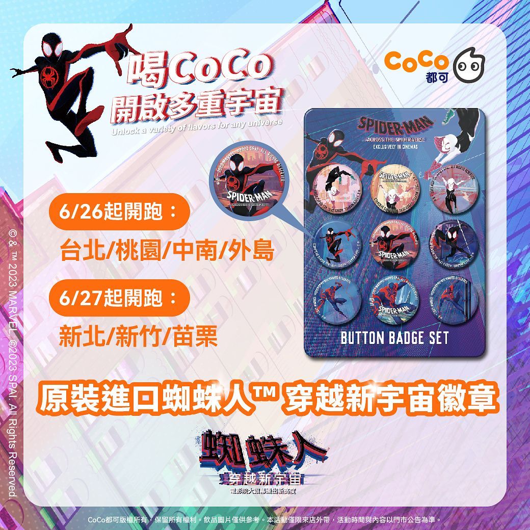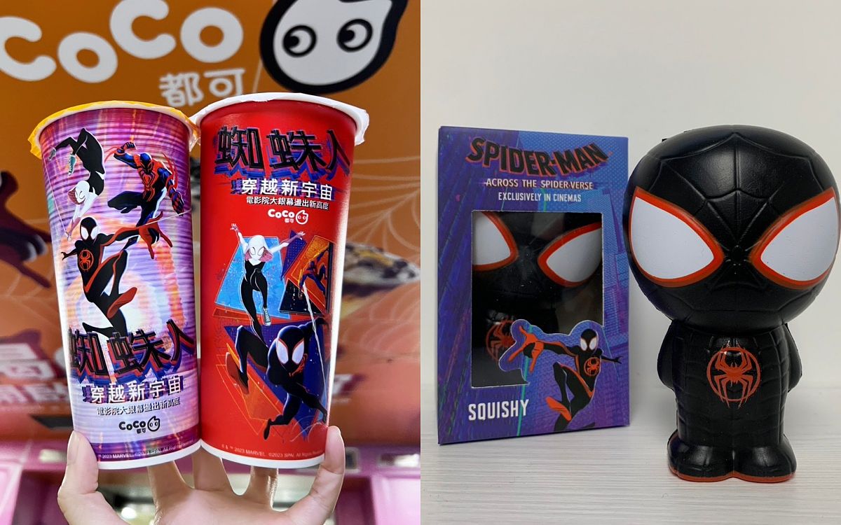 CoCo都可與電影院現正熱映中的《蜘蛛人™ :穿越新宇宙》推出跨界聯名活動,共有2款蜘蛛人™人氣角色集合亮相於大杯手搖杯身,並且購買指定飲品「星空葡萄」、「檸檬奇遇桔」、「珠絲奶茶」 任二杯,免費送原裝進口《蜘蛛人™:穿越新宇宙》徽章,單筆購買9組(指定套組) 即贈造型紓壓球公仔,數量有限,換完為止,活動時間至7/31止。