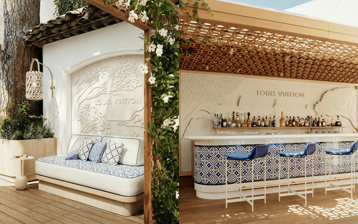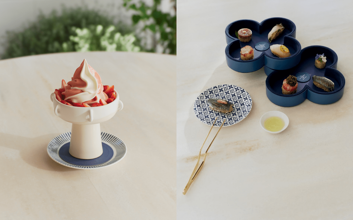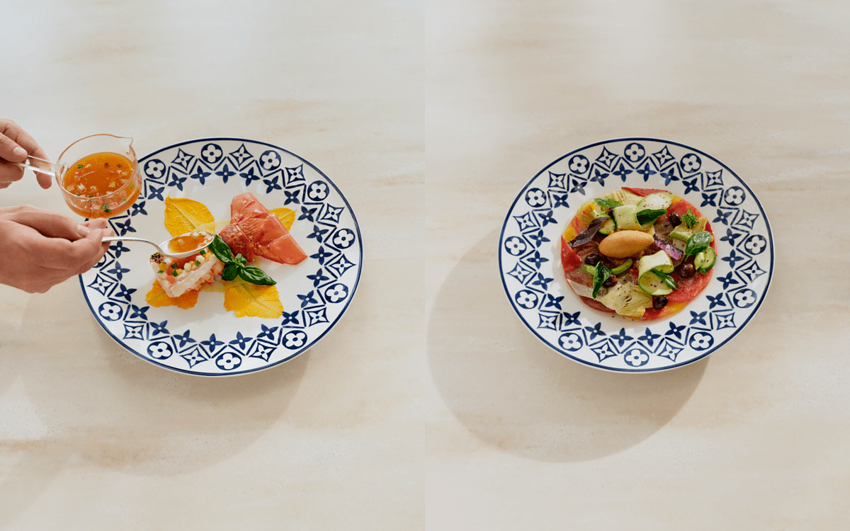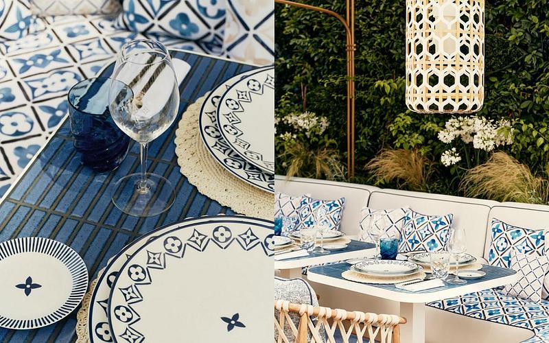 餐廳裝潢同樣深受路易威登的美學所薰陶,從餐具到花園中酒吧的舒適靠墊,都採用路易威登最新「By The Pool」度假系列中的藍白瓷磚圖案。大量使用石頭、木材和陶瓷,符合路易威登推崇的自然風格,店內處處可見 Objets Nomades 生活藝術家居系列的作品,包括 Lanterne By Zanellato and Bortotto 和 Origami Flowers by atelier oï。