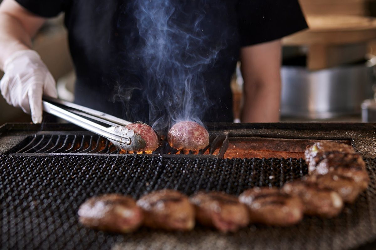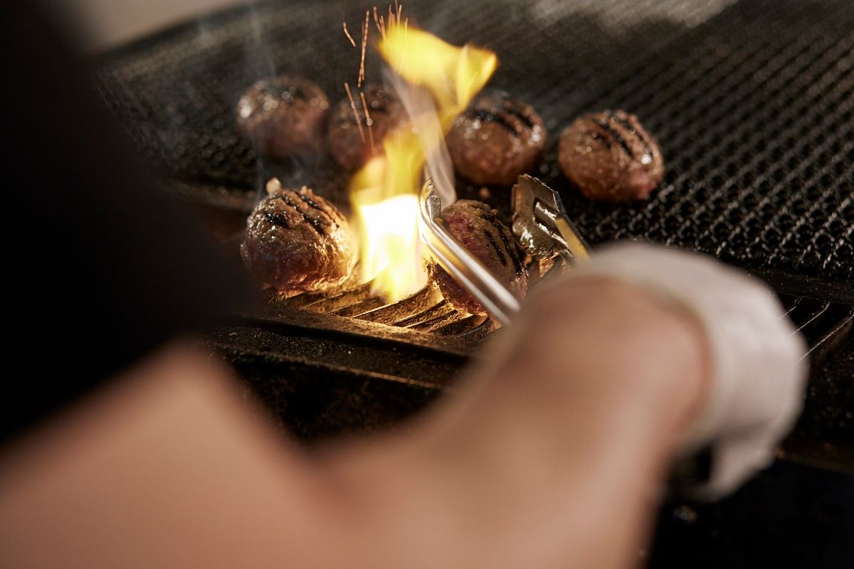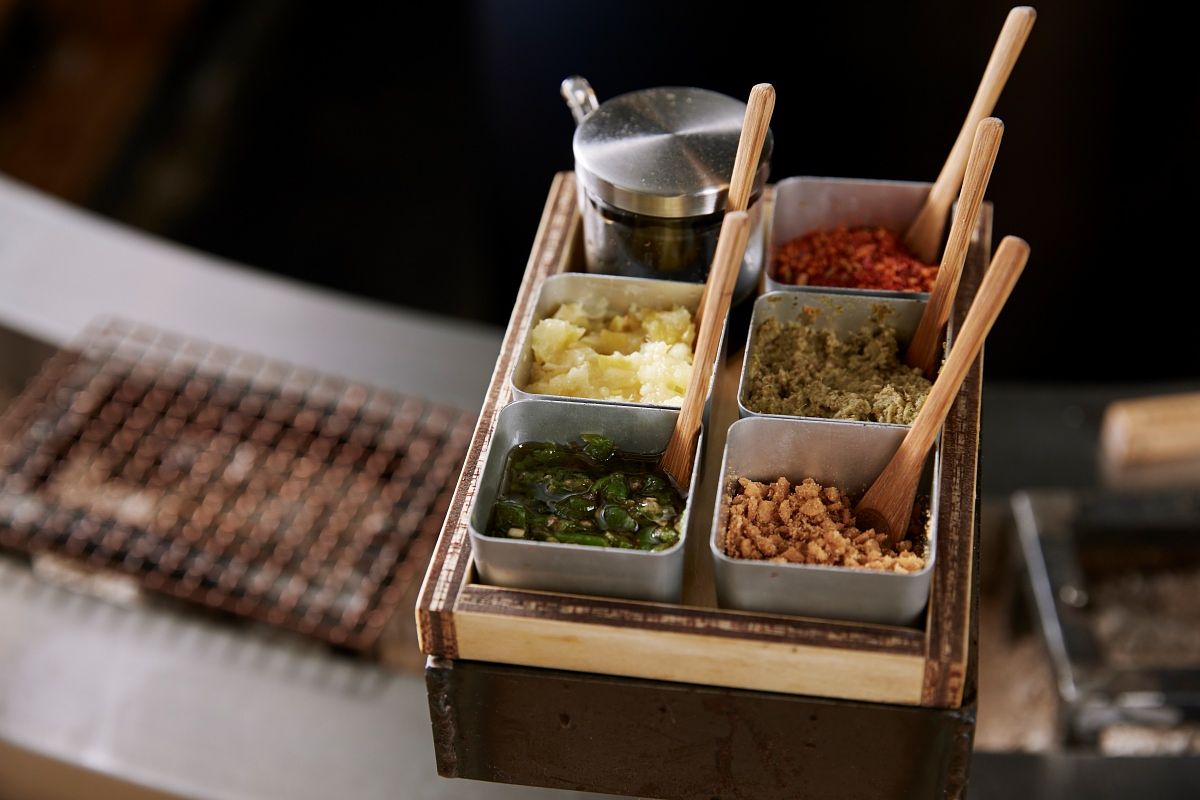 每個座位都有提供8種特製配料,顧客可嘗試各種不同配料,尋找自己喜歡的味道跟吃法!每個漢堡排做成90g的小份量,希望顧客到最後一口都能享受現烤的美味,燒烤師傅也會邊觀察顧客的用餐速度邊烤下一塊肉!