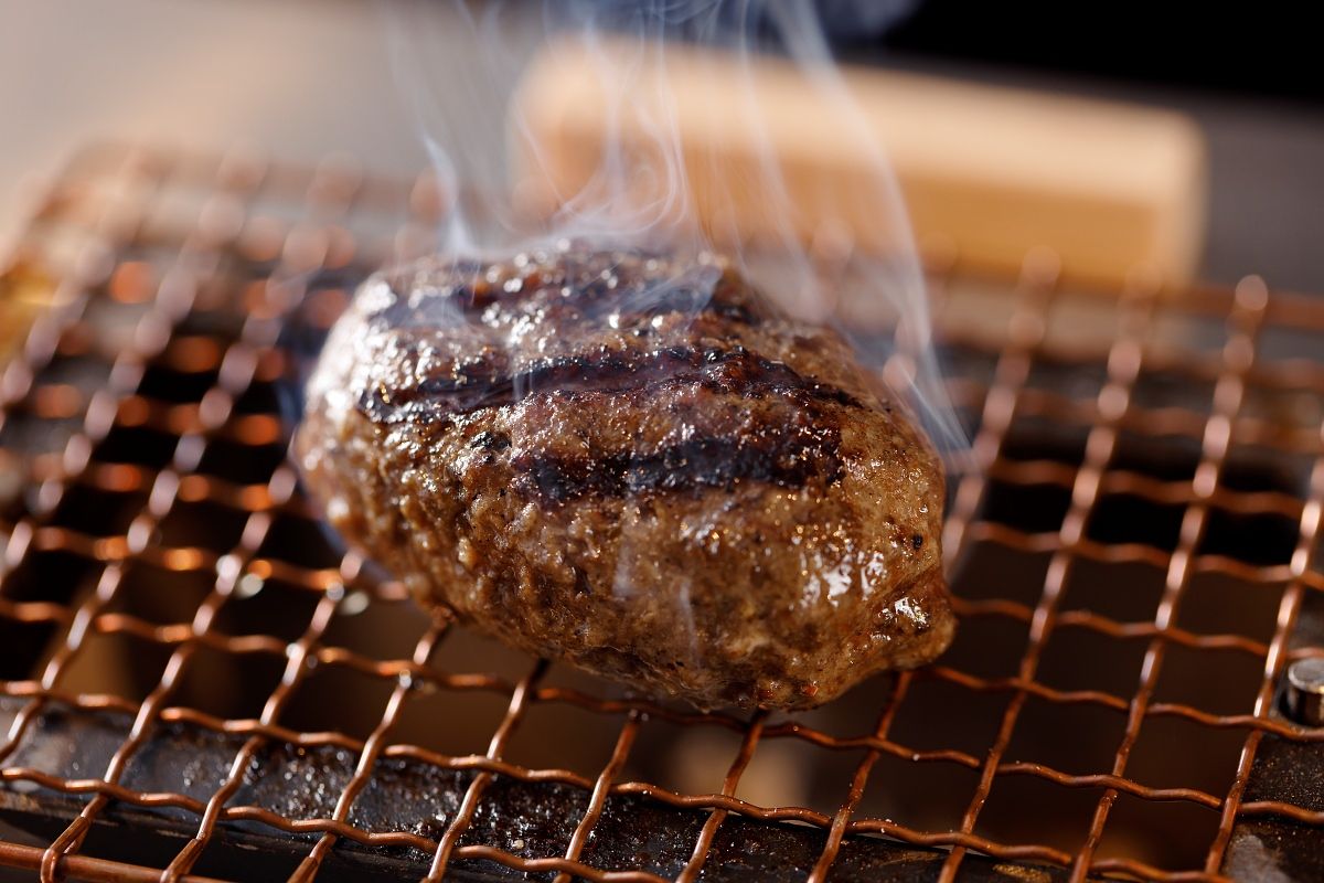 每天早上在店內絞好100%的純和牛絞肉, 並在顧客面前以炭火燒烤, 搭配用羽釜鍋現煮的白飯以及豐富自製配料,用現烤漢堡排的美味,為用餐者帶來幸福!