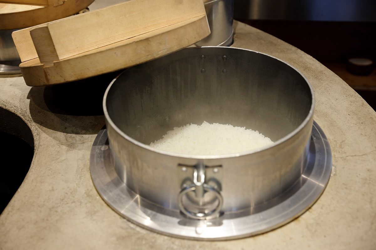 白飯可免費續碗!「挽肉と米」會將米在水中充分漫泡後乾,並依季節而異,配合適當水量,仔細計算米的分量。接著在羽釜鍋中用大火一口氣將米煮熟,就能煮出鬆軟又美味的白飯,煮飯的程序會依照米的品種進行微調。 飯灶上不間斷地輪流烹煮,因此顧客不管續多少碗,吃到的都是新鮮現煮的白飯。