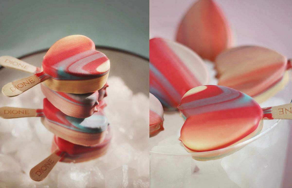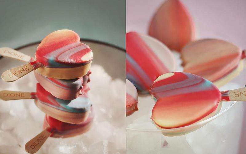 來自立陶宛的冰品品牌「DIONE」首度來台,同步推出的「漸層愛心冰棒」,選用比利時白巧克力及草飼牛的新鮮牛奶製作,不同於市售冰棒規格整齊劃一,愛心形狀冰棒以天然色素暈染,營造出不同的大理石紋漸層,並且每個漸層交錯的顏色、位置都不同,冰棒如同視覺藝術般,又仙又美!