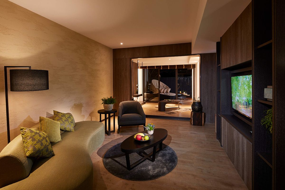 「尊榮洋甘菊別墅」設有獨立的門庭入口,空間挑高營造出無壓迫的居住環境,後院有戶外泡湯池、躺椅、花園,還可享有管家服務、獨立的更衣室,較大的香草蒸氣室!