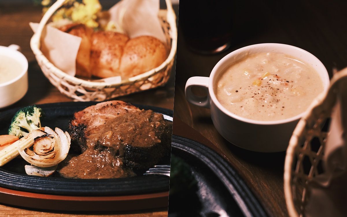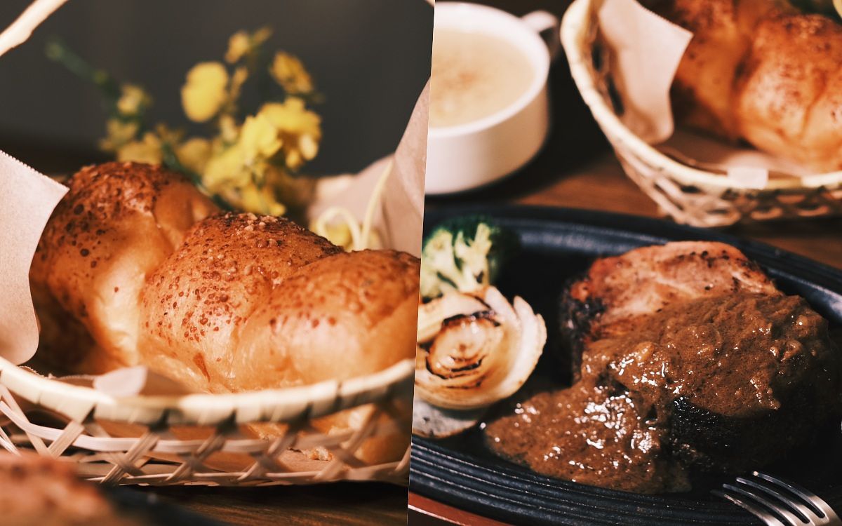 炭烤滋滋厚切牛排澆淋上香濃熬製的牛肉咖哩醬,喝一口濃郁多料的磨磨茶玉米濃湯,搭配充滿奶油香氣又鬆軟的復古餐包,最後再來兩款精緻茶湯,還可以帶回草器小花束,這麼浪漫完美的牛排套餐,讓春風吹走你的憂愁、滿足你的五臟廟!