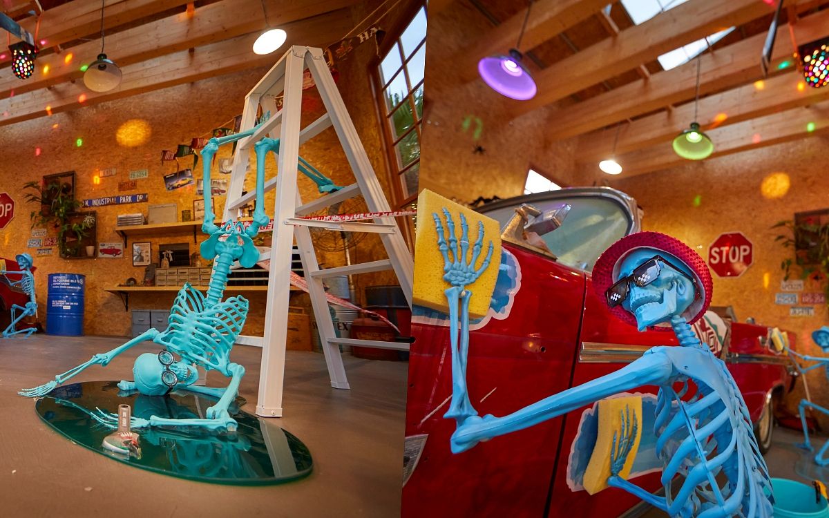 圖片來源:品牌提供屋前「打混很久的骷髏工人」正在沒完沒了地哈拉聊天,一旁機械聲嘎嘎作響,彷彿沒有收工的一天。騎樓下「心碎骷髏老人與骷髏狗」在搖椅下納涼,悠閒享受秋日時光。走進車庫內,立刻就能看到「永遠嫌車不夠亮的愛車骷髏人」,三人忙著拿水管、洗車身,現場更備有海綿、水桶,邀請大家一起耍潔癖,加入洗車行列。而右側還有修燈修到「摔破骨頭的骷髏水電工」,大家可千萬不要跨入封鎖線,避免觸電!傍晚5點開始,屬於「骷髏人」的Disco舞會正要開始!在五光十色的燈光下,一起來搖擺身體。