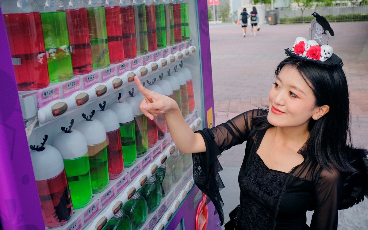 圖片來源:品牌提供 走到三期「萬聖骷髏工廠」,你會發現工廠變身成神秘詭譎的密室空間!高聳的招牌上纏繞著「木乃伊骷髏人」,遠遠就警告著大家生人勿近。但若你膽子夠大,坐在工廠門口,好客的「南瓜與骷髏老闆二人組」會請大家到一旁「萬聖販賣機」喝飲料。販賣機內的「地獄特調」滿是蜘蛛、昆蟲,喝了別有一番滋味。想一窺工廠內狀況,會發現左手邊出現的Candy Factory「神秘夜光古墓」。古墓上不只躺著螢光骷髏人、還有青苔、大蜘蛛漫佈,窗櫺間與畫像上更是鬼影幢幢,在七彩鬼火照映下,絕對讓你心慌慌!而工廠中間有扇門,可通往另個空間。白天你會發現這裡彷彿是廢棄的工廠,有開關箱、操控面板、布簾後還有工人的餐桌。但一到月亮高掛、時空交替的黑夜時分,這裡就會出現「神秘的骷髏工人」,透過浮空投影的技術,時不時俏皮吊掛在空間中,和你大玩躲貓貓!