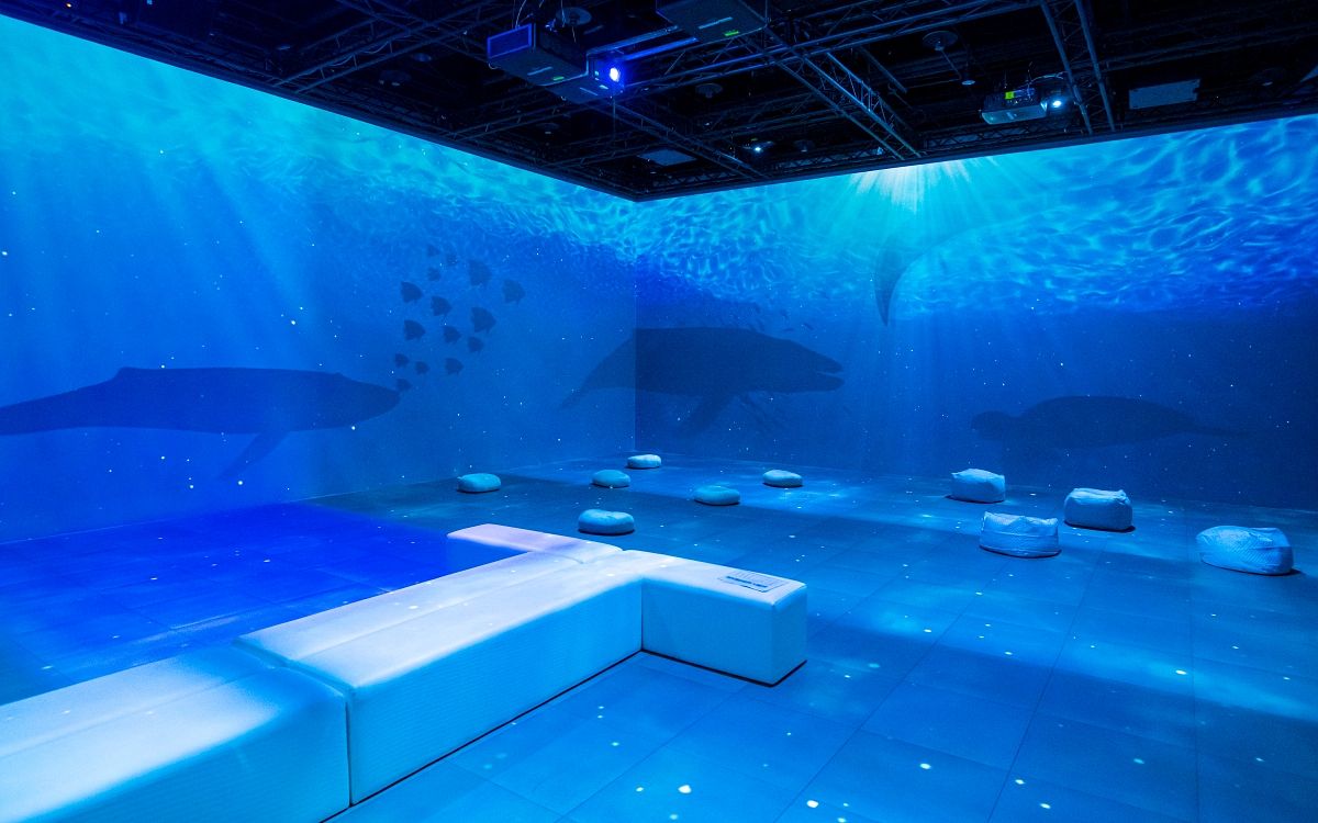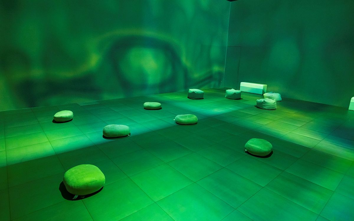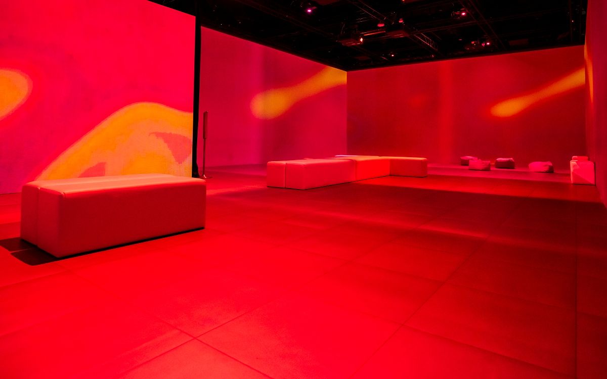 圖片來源:lululemon在「沉浸體驗區」中,分別以紅色代表「身體」、藍色代表「心靈」以及綠色代表「社群」的三個主題色為主軸,全景投影打造一個舒適、放鬆的沉浸式空間,並透過光影的變化營造出令人安心的氛圍,搭配舒緩輕柔的背景音樂以及冥想練習,為觀展者在喧鬧的都市中提供一個寧靜的空間,可以放下心中的煩躁,找回平靜、穩定的力量。
