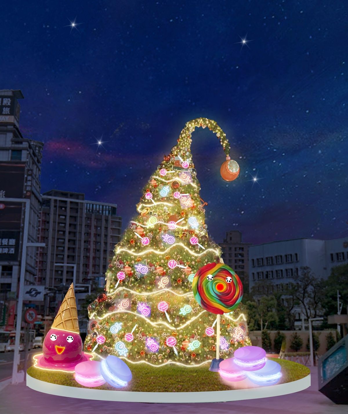 打造成抹茶蛋糕的耶誕樹,周圍設置大大小小繽紛的甜點蛋糕,包含摩卡蛋糕、提拉米蘇、草莓甜心、莓果蛋糕、黑色甜蜜、杯子蛋糕及大理石蛋糕,竹筍上閃爍星星氣膜,走進竹筍的天幕底下,夜間仰頭觀望可看見滿天繁星,層層光影美感設計,白天看則是宛如蛋糕糖霜般點綴整個耶誕樹。