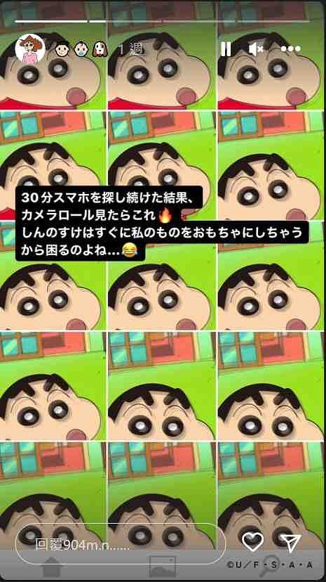 野原家也同樣上演著孩子拿著媽媽手機自拍的可愛劇碼!目前在美冴的PO文中,按讚數最高的便是小新在美冴不注意的時候,「私藏」把玩了媽媽的手機長達30分鐘,等到美冴找到手機之後,發現裡面多了好多張小新手拿不穩的晃動自拍照,其中還有共犯之一的妹妹小葵!為此美冴還發了一則限動,說自己的相簿裡全都是小新的自拍照,真是困擾 (笑)!