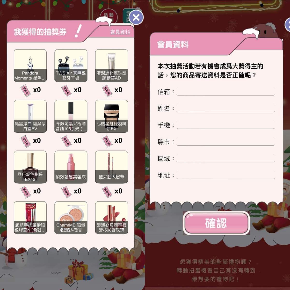 可以隨時查看自己目前獲得的抽獎券,也要記得點選會員資料,確認自己收件聯絡地址是否完整,以免好不容易抽到的禮物卻收不到喔~