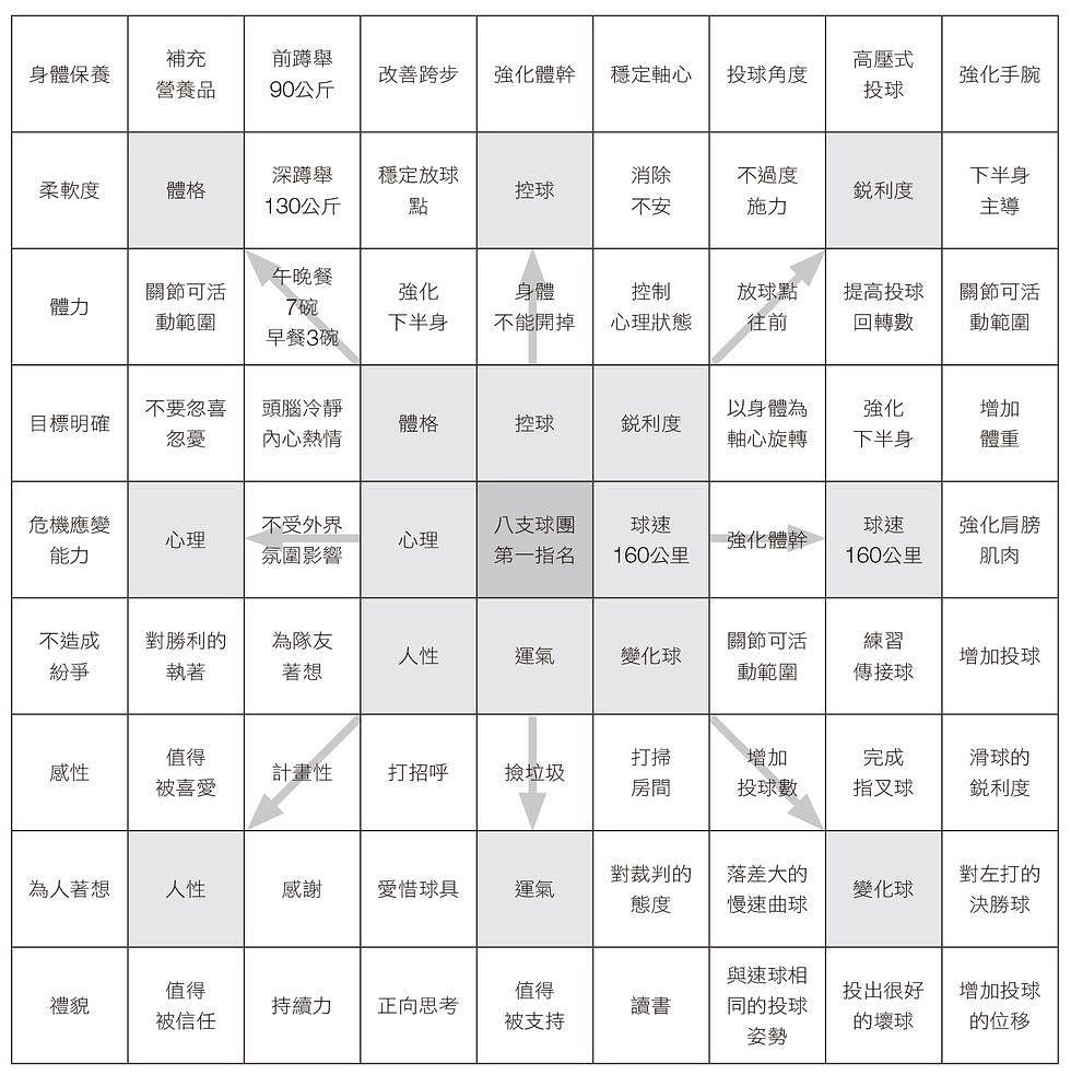 為了讓自己成為「最強棒球員」,大谷翔平從高一起就使用「曼陀羅計劃表」,規劃並逐步實踐目標。曼陀羅計劃表由81個方格組成,首先將「大目標」填入中央,再向外衍伸出達成此目標所要落實的8個九宮格,提高實現夢想的可能,就是靠著這樣一步一腳印,踏實往目標邁進的做法,幫助大谷翔平塑造出他成功的起點。