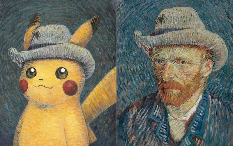 梵谷《戴灰色毛氈帽的自畫像》,對應戴著灰色毛氈帽的皮卡丘,皮卡丘眼睛閃閃發光~看起來也太呆萌可愛了吧!