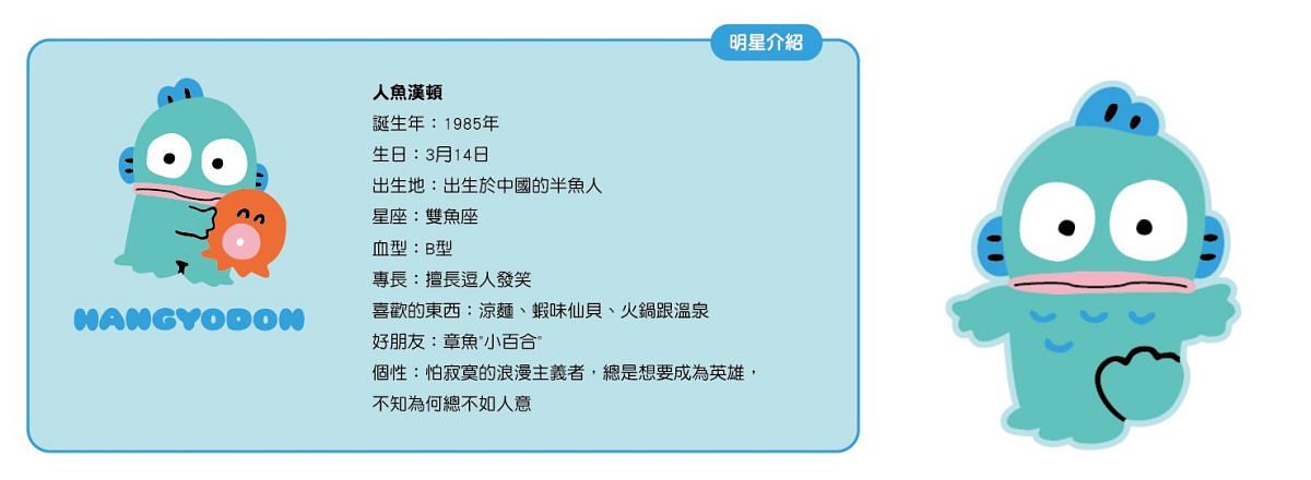要說人魚漢頓很冷門,可能很多人會不太同意,因為這位不算屬於既定標準的可愛角色可是有一派死忠粉絲呢!他的識別度很高,只是關鍵點在於沒有人很多人知道他也是由三麗鷗出產的明星之一!厚厚的雙唇配上圓圓的大眼,讓人一看就想笑!(這還真的是他的專長呢!)