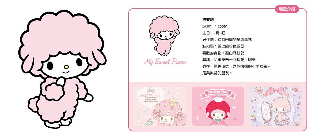 除了要認識美樂蒂的天敵「酷洛米」,當然也要認識她的好朋友「彼安諾」!總是在美樂蒂身旁扮演「最佳女二」的小羊女孩,外型就如同個性一樣溫柔可人,軟綿綿的模樣真的太討人喜歡。