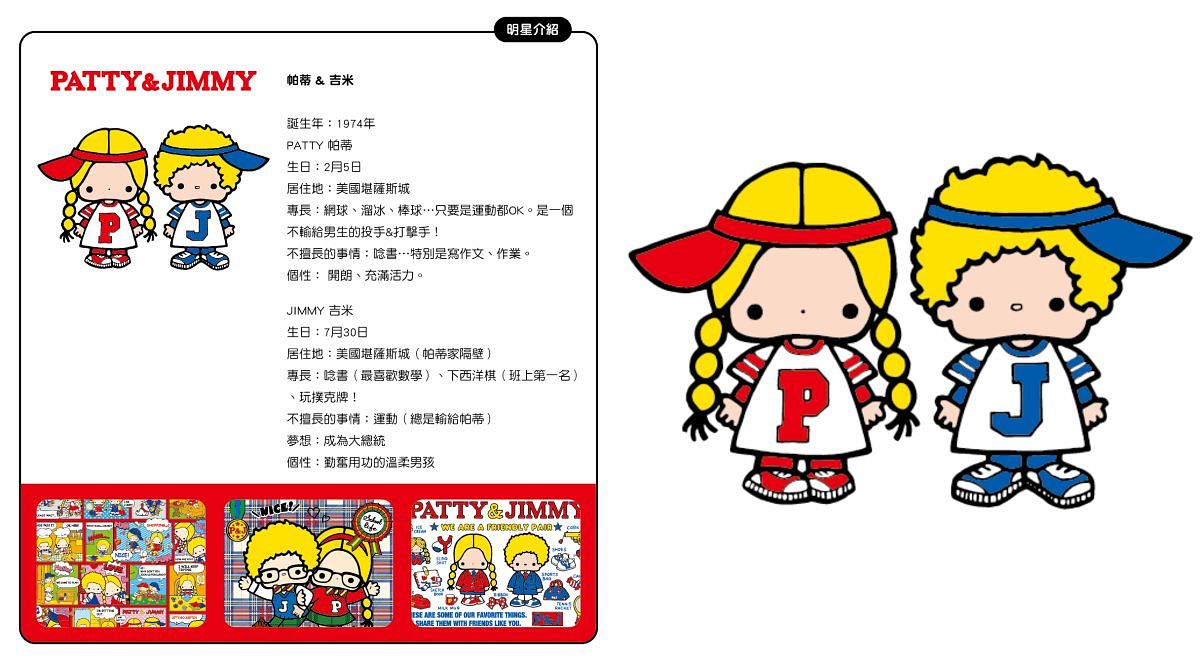 留著一頭金髮的Patty & Jimmy的角色設定是來自美國坎薩斯,一個熱愛各種運動,包含網球、溜冰、還有棒球,一個則愛讀書,互補互助的配合超級可愛。
