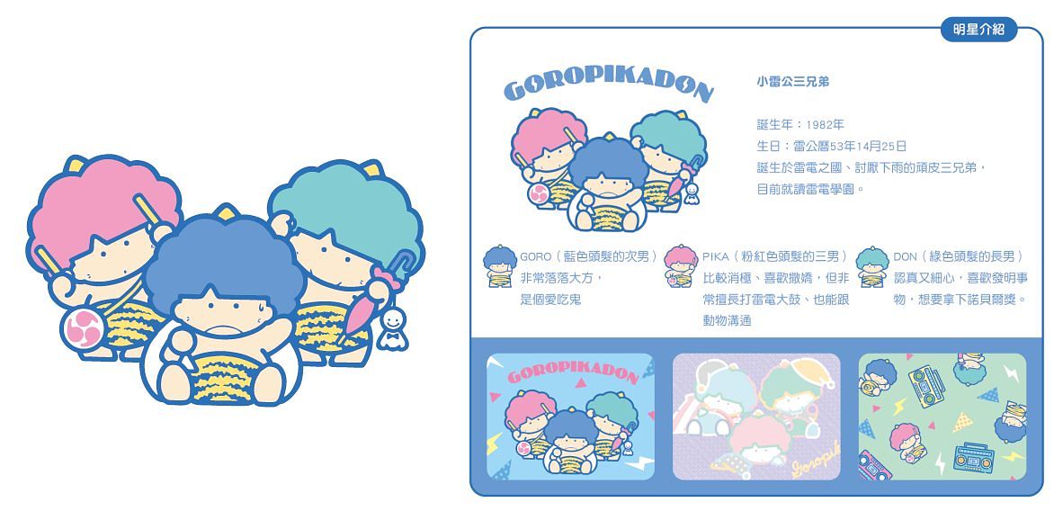 誕生於雷電之國的「小雷公三兄弟」卻很討厭下雨 (笑)。個性截然不同的三兄弟,綠色頭髮是大哥、蘭色頭髮是次男、粉色頭髮則是三男,各位認得出來嗎~