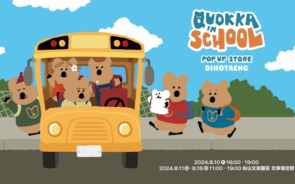 LINE FRIENDS 自 8 月 10 日起至 8 月 18 日將推出以短尾矮袋鼠聞名的 DINOTAENG 快閃店,以在學校展開的俏皮與天真爛漫的基底,於台北松山文創園區延續今年初在韓國 LINE FRIENDS 江南店盛大登場的特色快閃店——「QUOKKA IN SCHOOL DINOTAENG POP UP」!DINOTAENG 是以「MARSHVILLE」小鎮為背景,講述一群以 QUOKKA 為主角的朋友們尋找最佳棉花糖的冒險故事。「QUOKKA IN SCHOOL DINOTAENG POP UP」首次在台灣登場,讓粉絲們親身體驗 QUOKKA 與朋友們趣味的校園生活,由愛玩的 QUOKKA 和 BOBO、貪吃的 FATTY、聰明的 HATTY、熱衷園藝的DAISY、充滿好奇心的 BRIC,以及運動狂熱者 GRU,展開朝氣蓬勃的校園生活。