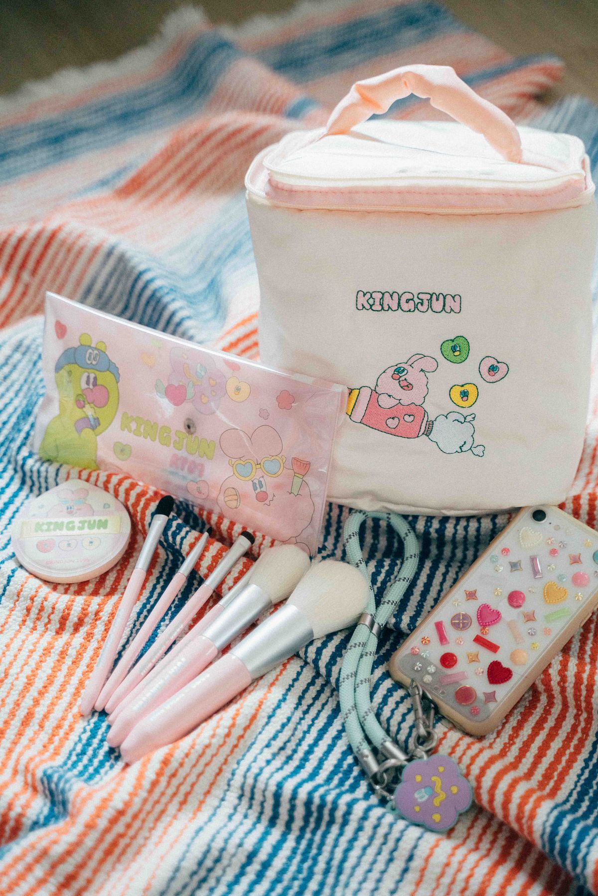 妝變刷具六件組,一包裡面含有蜜粉刷、腮紅刷、遮瑕刷、眼影刷、暈染刷、眼線刷日常妝容需求全部都幫你照顧到,還附上超可愛KINGJUN收納袋,就算出門旅遊也方便。另外妝點立體化妝包超大容量配上KINGJUN可愛的蠢兔刺繡,不只可愛還很實用,常常出國的你再也不用擔心東西會散落在各處了。出門手上滿滿都是東西,12枚印花即可兌換妝型手機短掛繩,內附夾片不怕手滑,妝點手機短掛繩可承受5公斤拉力的編織繩設計加上可愛的病毒花吊飾還附贈超萌蠢兔手機墊片!