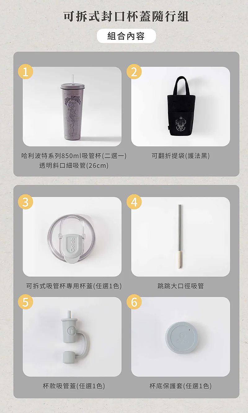 內容物:不鏽鋼陶瓷易潔層吸管杯 任選 X1、哈利波特系列 可翻折提袋 X1、吸管杯專用杯底防刮保護套 任選 X1、矽膠防塵【細】吸管蓋 任選 X1、跳跳大口徑吸管 25CM X1