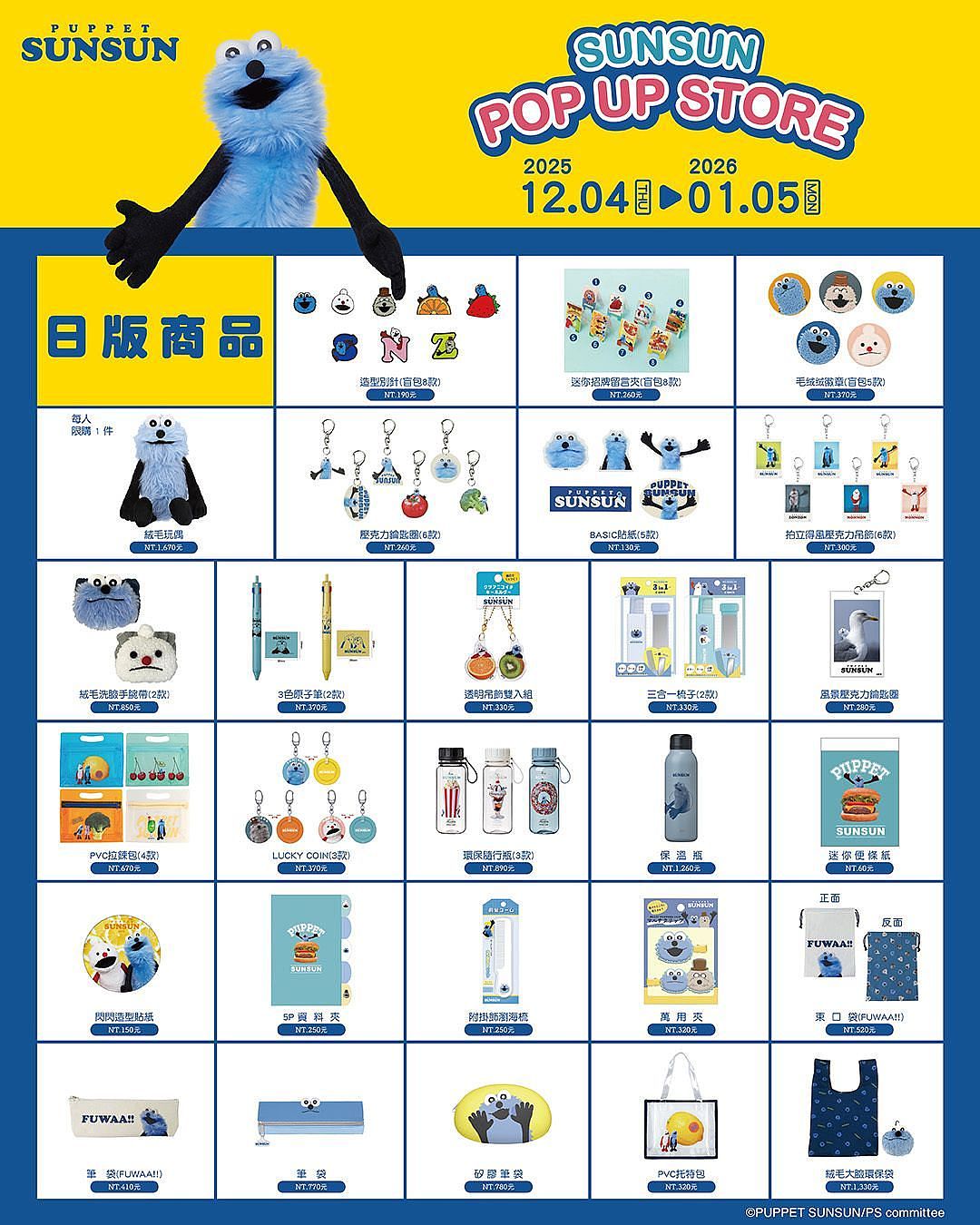 帕比順順 PUPPET SUNSUN 這次快閃店也推出多款超實用的療癒小物,從玩偶、文具到可愛配件一次全包,讓粉絲日常都被順順的大眼萌氣包圍!