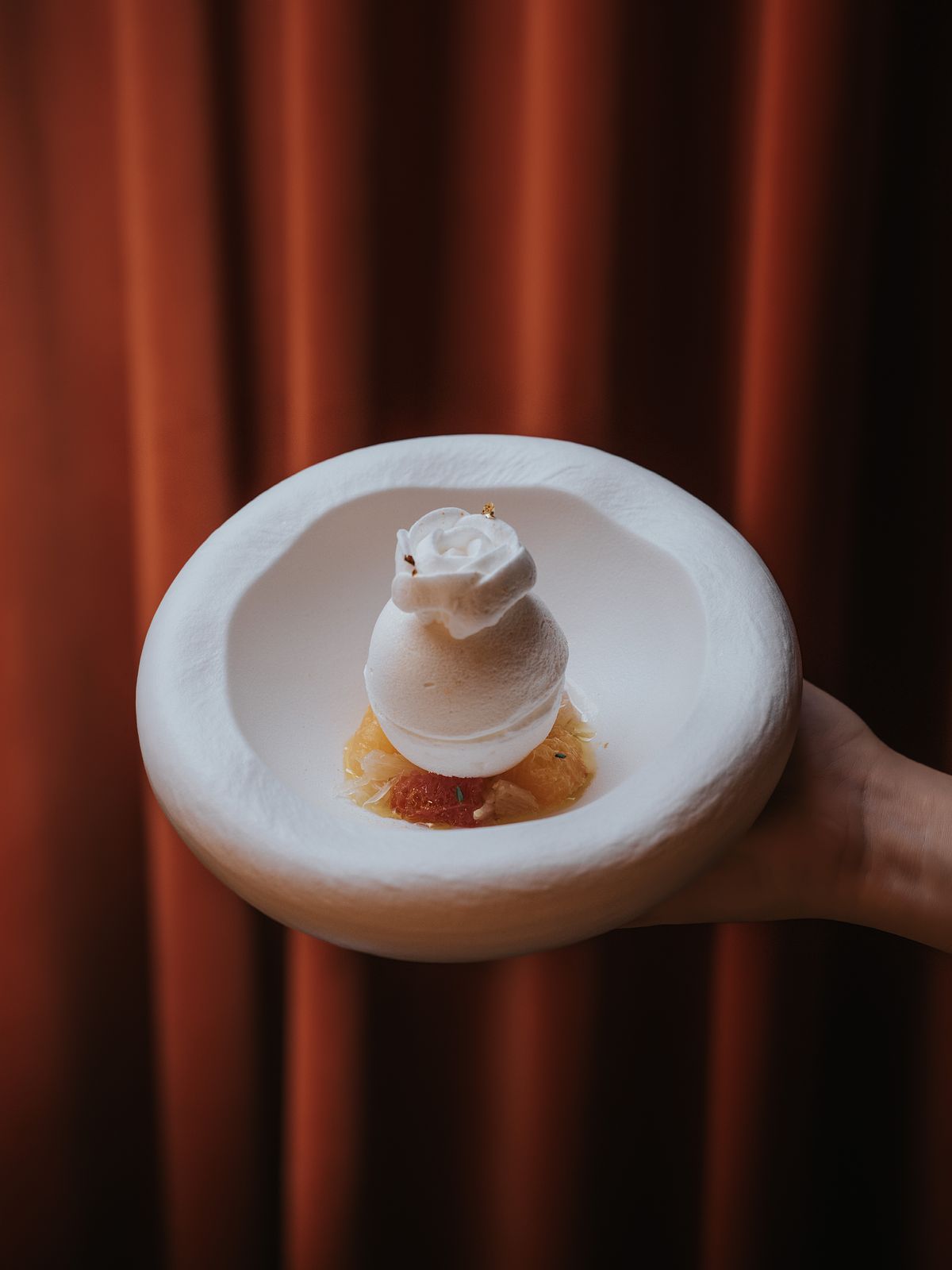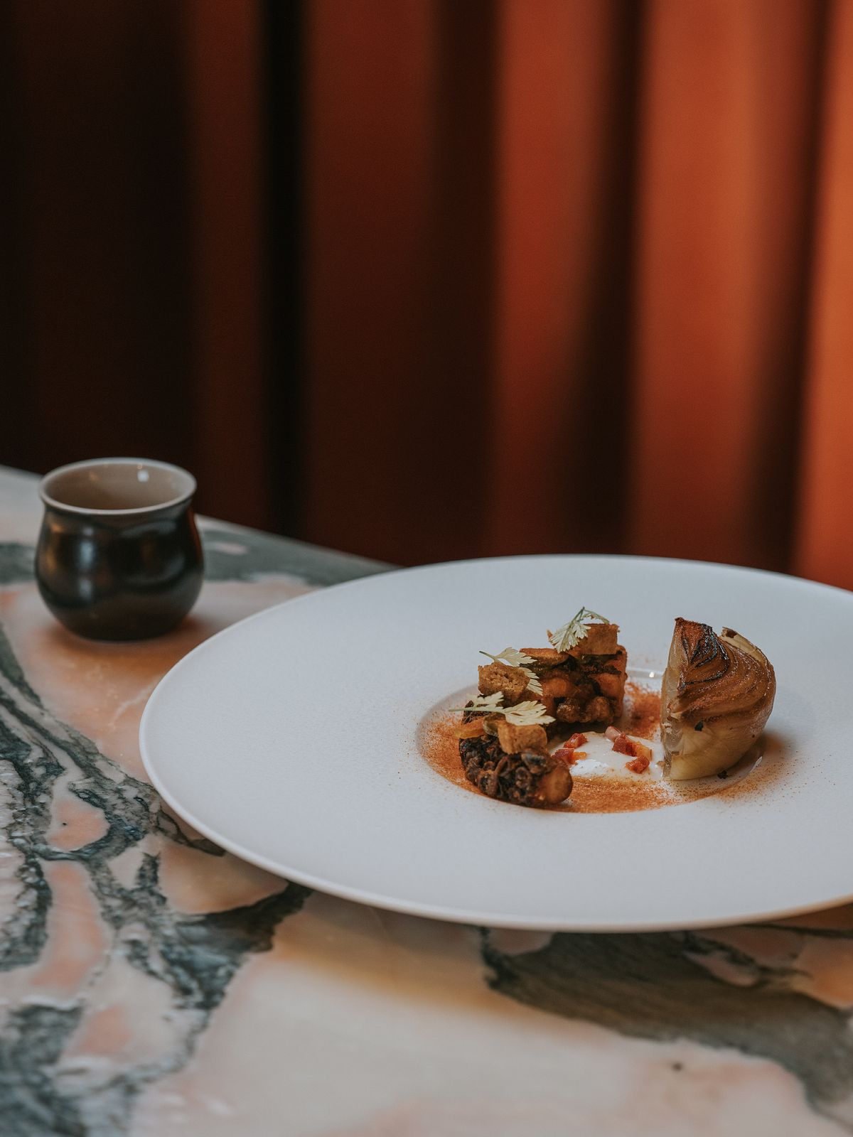 以 Devialet Phantom Ultimate 全新色 Deep Forest 為靈感,將其「柔霧、內斂卻暗藏能量」的設計語彙延伸出一道融合自然的料理,以風拍葉聲、蟲鳴與山勢的自然迴聲轉化為味覺上的層次堆疊,如同 Phantom 霧面外觀靜謐中湧動張力。