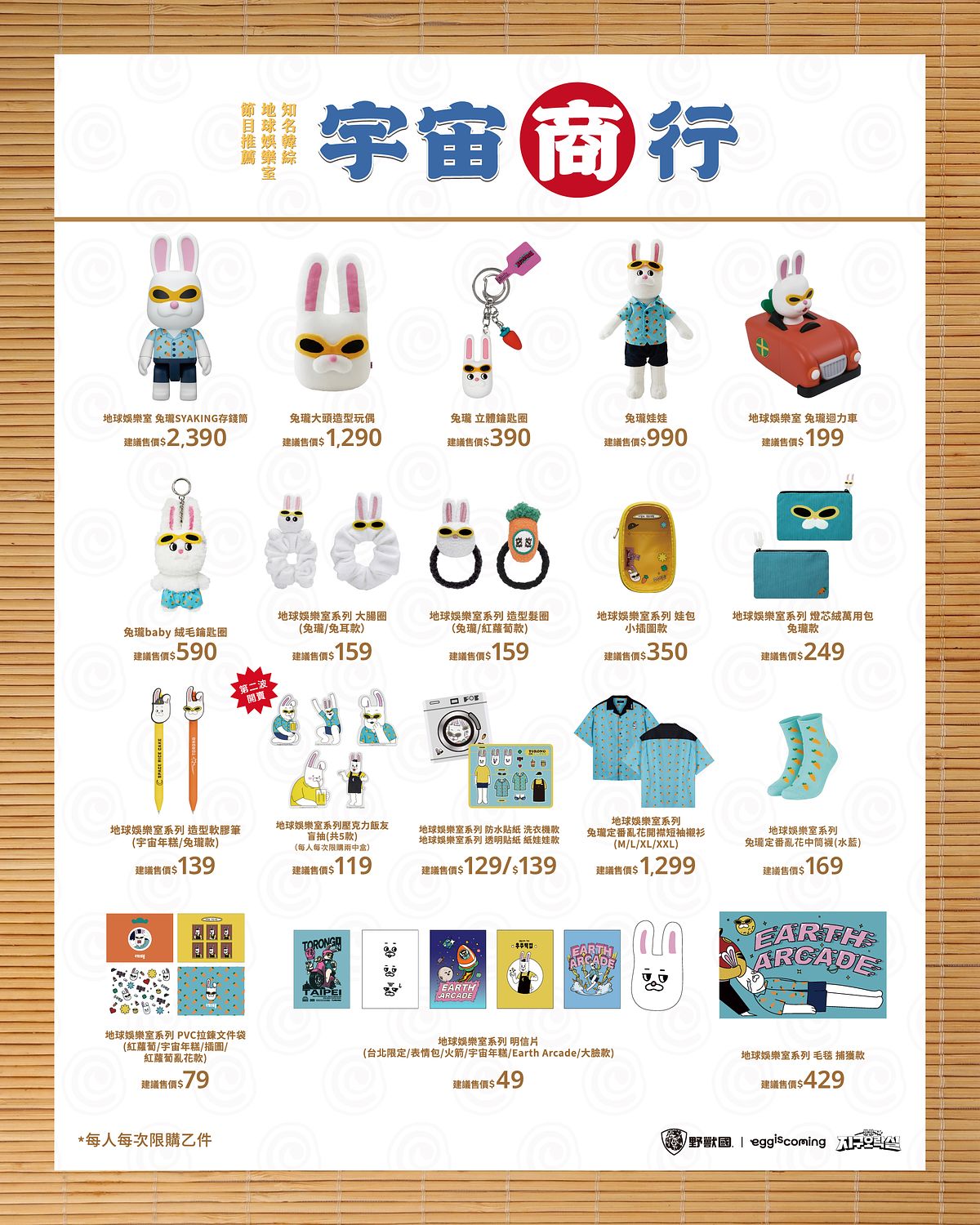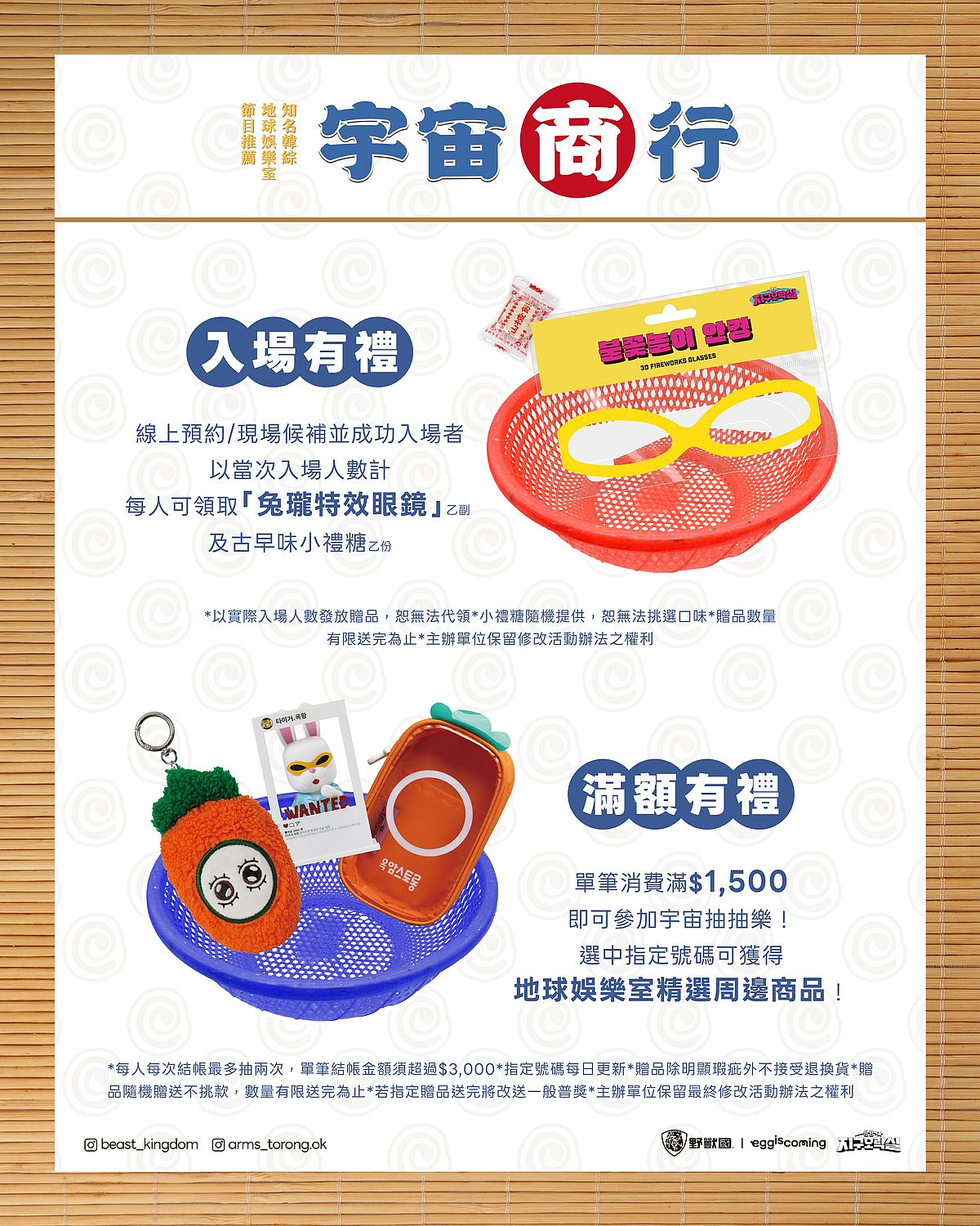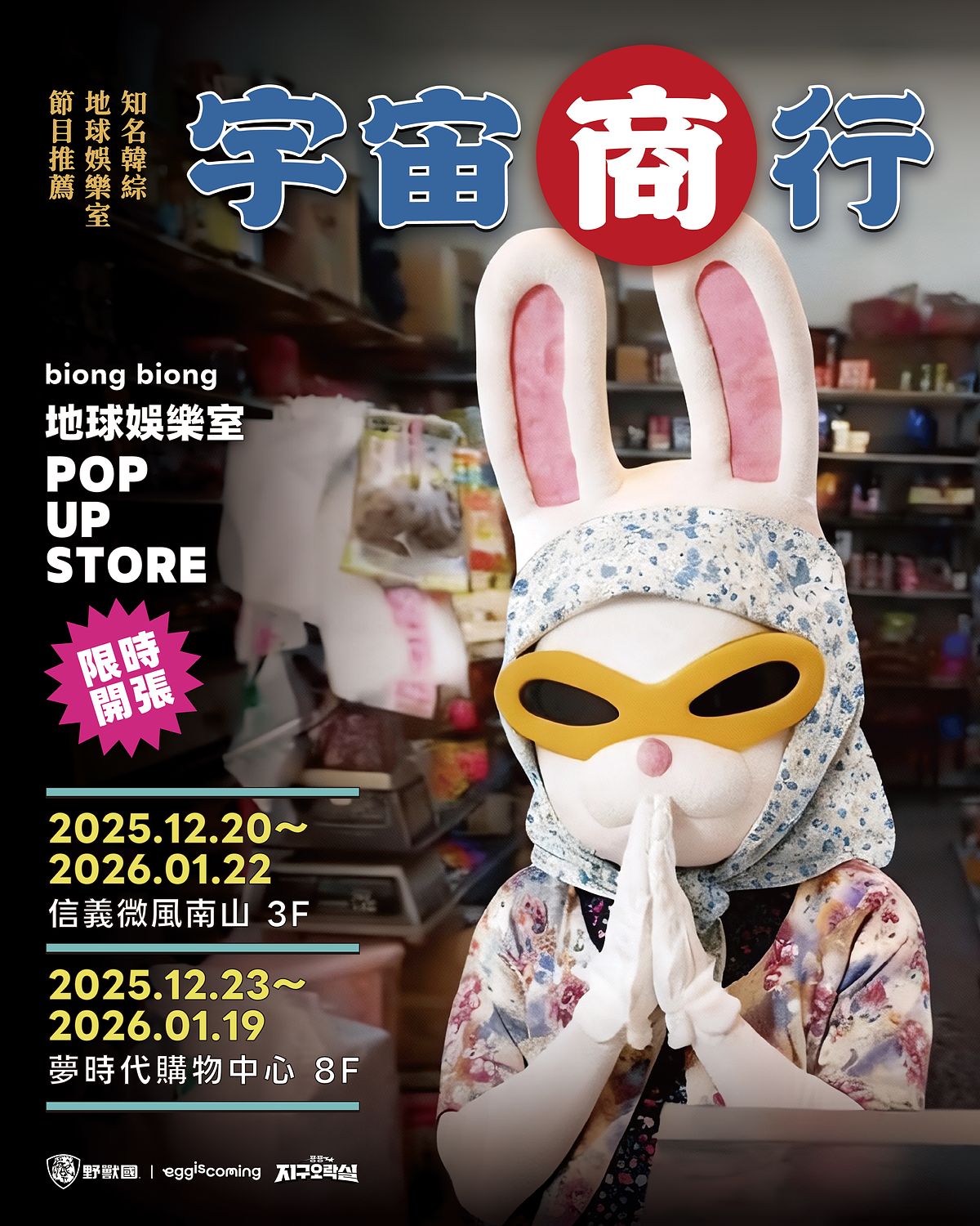 延續 2024 年《Biong Biong地球娛樂室》快閃店在台灣掀起的熱潮,今年「野獸國」再度攜手韓國節目製作公司「Egg is Coming」,推出全新升級的《Biong Biong地球娛樂室》 「宇宙商行」 快閃店。以台灣古早味柑仔店為主題,打造充滿「台灣感性」的「宇宙商行」。節目人氣代表角色月球兔子「兔瓏」也特別換上「阿珠罵」偽裝,潛伏店內與粉絲見面。這次更將第三季的多項經典攝影道具空運來台,讓粉絲走入節目情境,重溫滿滿笑點與感動!