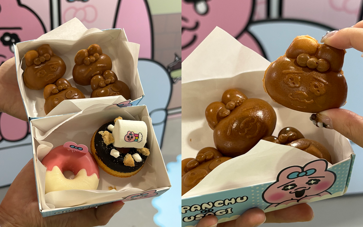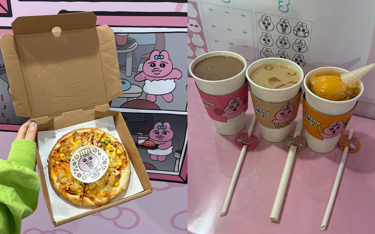 快閃店推出多款限定餐點與飲品,滿足味蕾又療癒心情。現場單筆餐飲消費滿 250 元,即贈光柵貼紙 1 張(共4款隨機,數量有限,可累贈)。隨機表情雞蛋糕擁有超多豐富表情,甚至可能拿到它的小褲褲造型,驚喜又可愛; 6 吋燻雞 Pizza 濃郁香氣撲鼻,搭配化身廚師的褲褲兔一起享用;雙色甜甜圈粉白巧克力搭配兔耳造型,彷彿褲褲兔化身其中,搭配巧克力棉花糖,細看還能發現藏在上面的褲褲兔身影;飲品則有夢幻漂浮草莓蘇打、黑糖珍珠奶茶以及暖呼呼草莓熱奶茶,皆附專屬杯套與吸管套,好喝又好拍!(所有餐飲均會以完整狀態提供,不會重演褲褲兔在故事中那些「可愛又倒楣」的橋段)