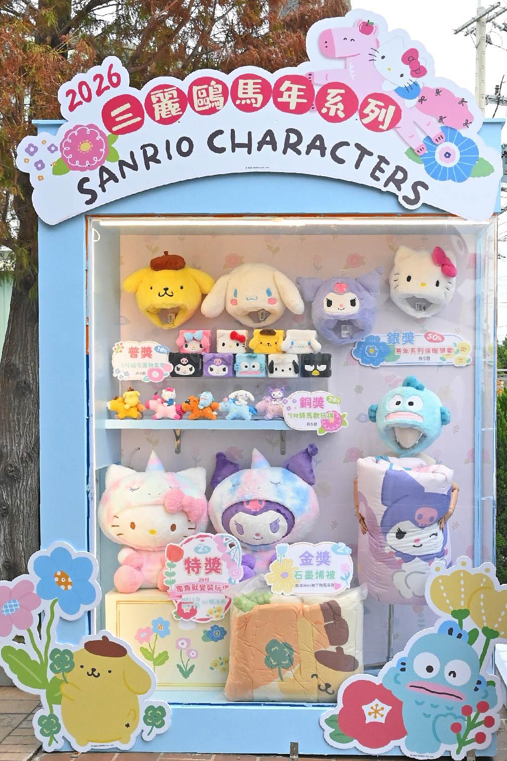 扭蛋內容同時集結多款銀賞、銅賞與普賞好禮,包括馬年限定造型的三麗鷗角色保暖頭套、可愛又實穿的居家配件,療癒程度滿分;此外,還有銅賞的騎馬造型玩偶與普賞絨毛收納置物盒等多樣品項輪番登場,從大型玩偶到日常實用單品一應俱全。現場同步推出多款三麗鷗人氣新品,包括趴姿雲朵系列、獨角獸主題盲盒與實用又可愛的椅子款式,從造型玩偶到居家實用單品,讓粉絲不只拍得開心,也能把滿滿可愛一次帶回家,成為春節送禮與自用的熱門選擇。