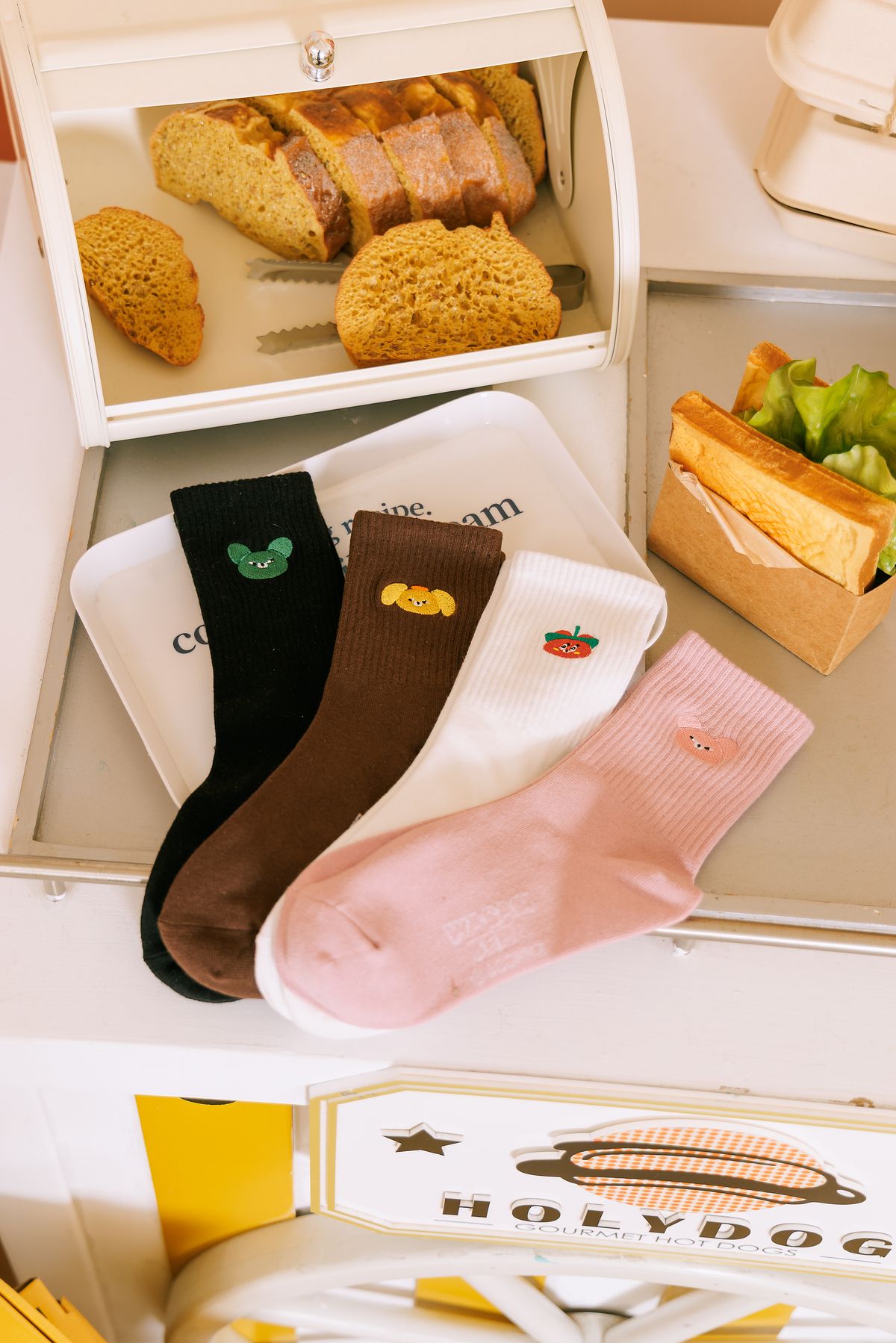 Wasabi Bear 聯名電繡圖案簡約耐看襪筒採用鬆緊螺紋編織,久穿不鬆垂中筒高度搭配球鞋、樂福鞋都合適柔軟棉質彈性纖維,兼顧透氣與耐穿度把舒適留在腳下,送禮與自用都更有記憶點。