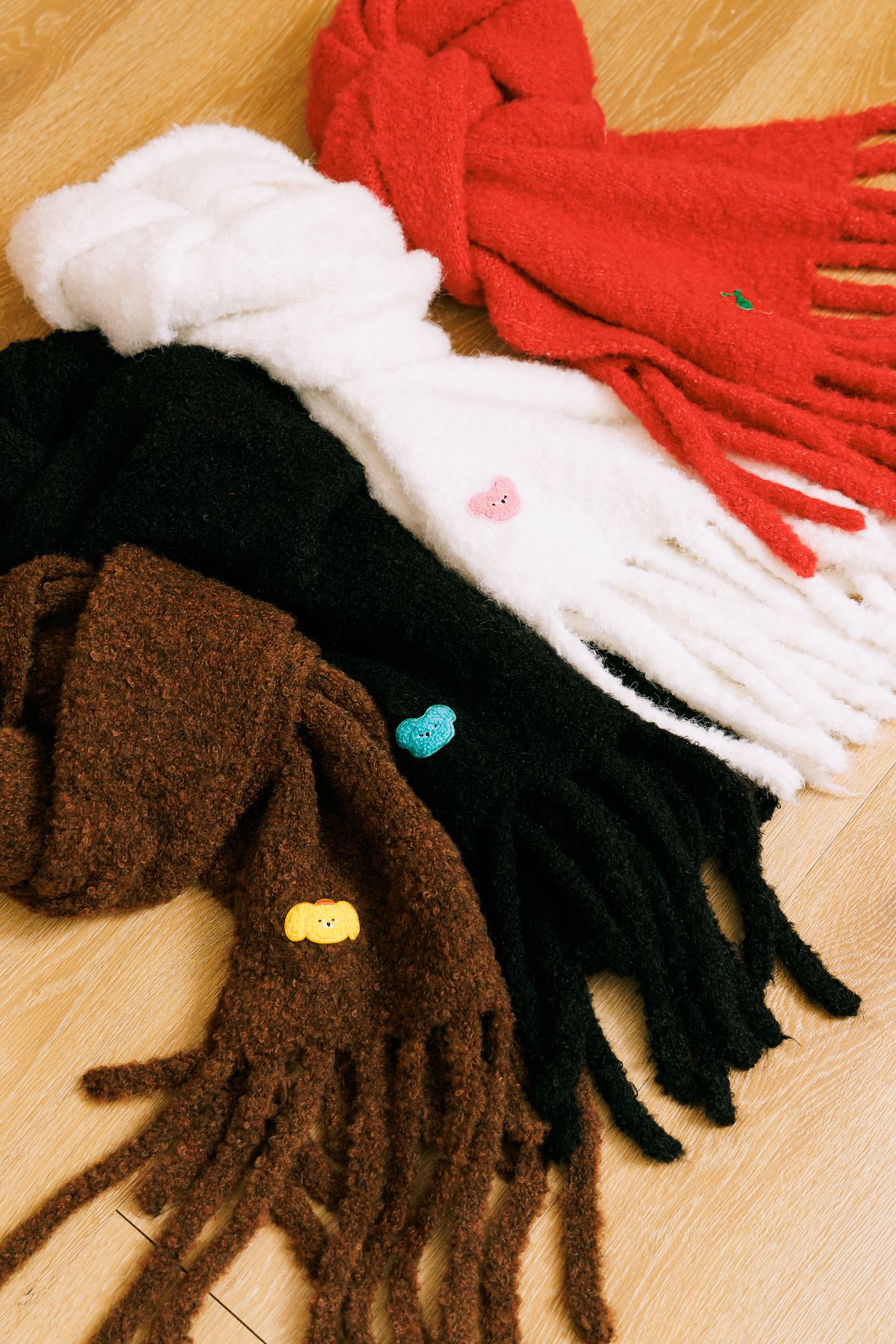 把 Wasabi Bear 的療癒角色魅力化成一條每天都想圍上的溫暖陪伴。選用羊毛混紗材質,觸感柔軟細緻兼具保暖度與輕盈感,長時間配戴舒適不厚重自然顆粒感織紋,為冬日穿搭增添層次與溫度四色角色一次集結,各自以低調刺繡細節點綴在簡約配色中藏入剛剛好的可愛亮點,流蘇設計自然垂墜,隨步伐輕輕擺動。