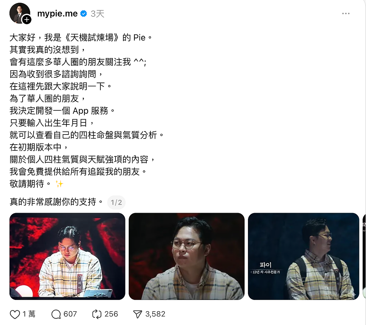 隨著多段震撼預測畫面播出,不少參賽命理師人氣直線飆升。其中,在首輪成功推測警察死因而備受關注的「四柱命理師」Pei,近期更以中文在 Threads 上驚喜與網友互動。他透露節目播出後收到大量諮詢,未來計畫開發一款免費命盤 App,作為回饋支持粉絲的方式,再度引發討論。