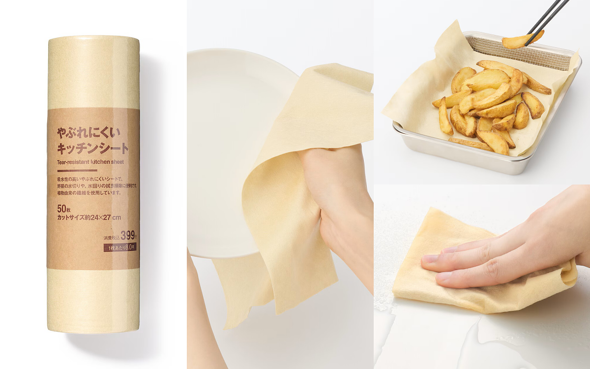 這款廚房紙巾真的看似簡單實際上相當實用。選擇植物來源纖維製成,可用於料理時吸取食材多餘油份,同時可於清潔時擦拭水份。即使沾水也不易破損、耐用性高可以反覆利用多次。