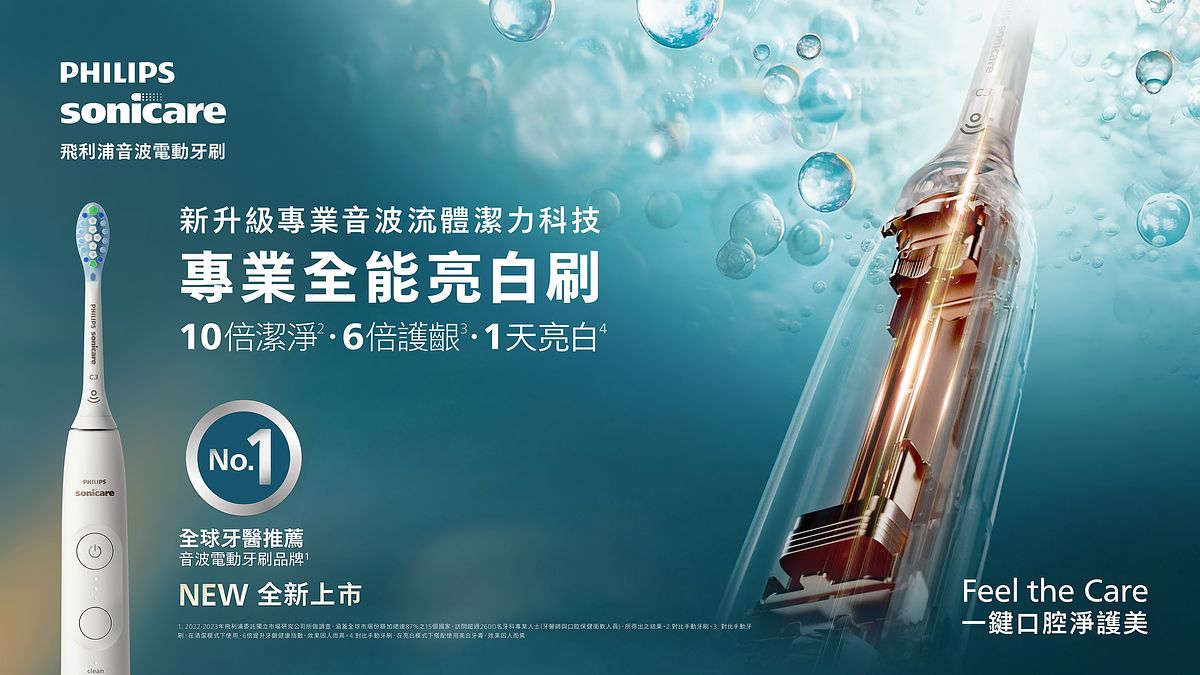 隨著個人健康意識提升與智慧科技走入日常生活,全球健康科技領導品牌飛利浦(PHILIPS)持續深化在個人健康照護市場的布局,看準台灣高比例口腔健康照護需求,正式在台推出全新產品「Sonicare 專業全能亮白刷」,作為飛利浦 Sonicare 累積 33 年研發經驗、集結核心技術的代表作,專業全能亮白刷搭載新升級專業音波流體潔力科技與全新雙核音波精控馬達,可精準深入清潔盲區,提升難刷部位清潔效率達 40%,達到 10 倍潔淨力、6 倍護齦效果、1 天亮白,實現「淨・護・美」一步到位的全方位潔牙升級,提升電動牙刷的專業標準!