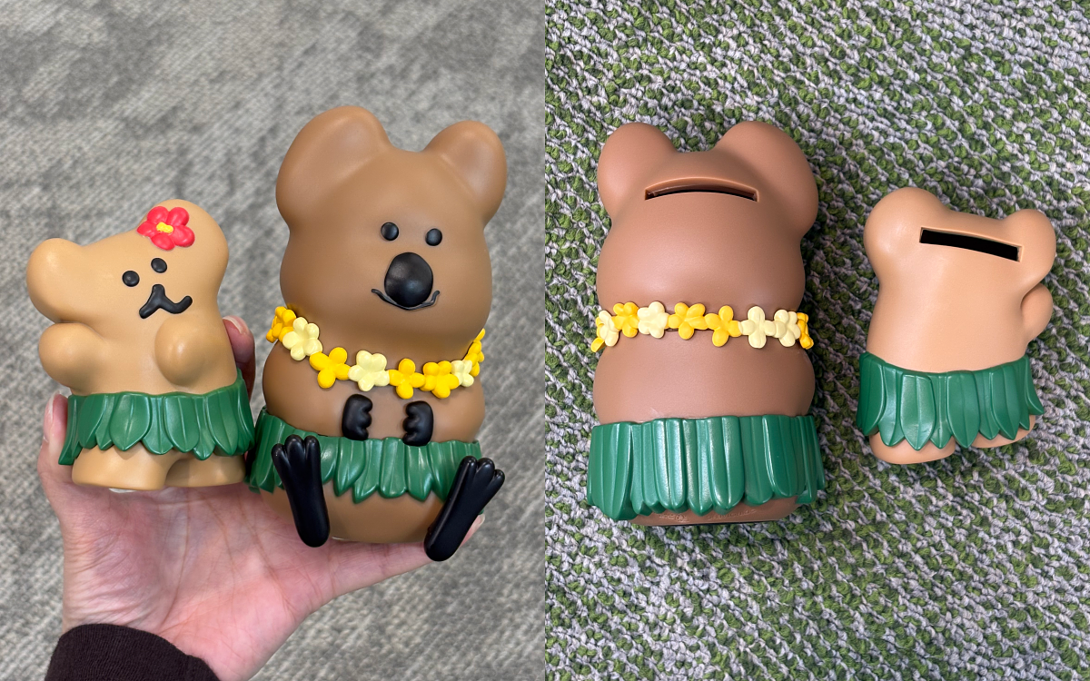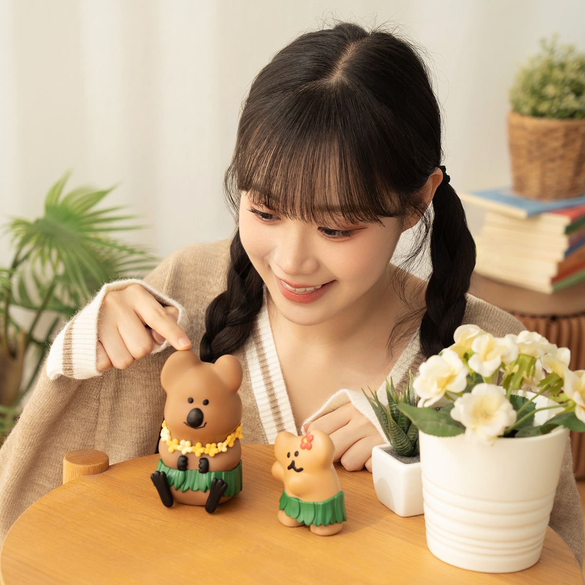 不可能連矮袋鼠都有曬黑版本的吧!Quokka 跟 Bobo 化身成曬黑矮袋鼠,身穿草裙搭配充滿夏威夷風情的花圈,可愛指數爆表!手掌大小的掌心儲金桶小巧可愛,也很適合放在辦公桌上當作實用的擺飾。