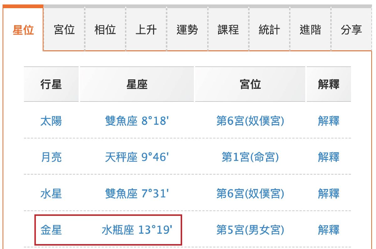 可以先上網到『占星之門』輸入個人資料查詢你的星盤,對照金星星座就可以知道囉!