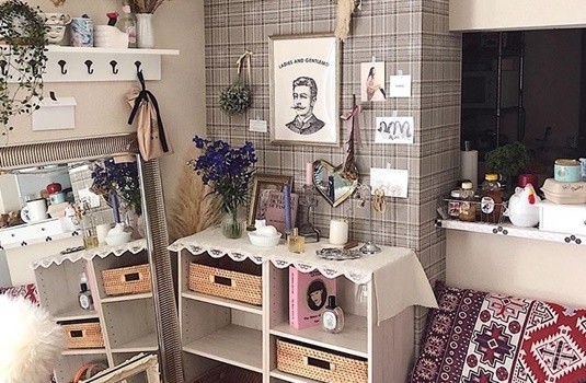 最後來談裝飾的部分吧!白淨淨的牆面看起來有點寂寥,選擇一條喜歡的掛布吊掛在牆上是最簡單不費力的方式。進階版的部分,找一個帆布袋放入乾燥花或鮮花,就能自帶韓風氛圍;掛上金色架框,夾上喜歡的照片或紙條,除了美觀,還能當作備忘版呢!