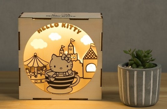 小夜燈系列設計HELLO KITTY經典居家場景與遊樂園版本,以及蛋黃哥難得出門旅行的趣味遊客照,利用黏貼式的暖光LED燈條,以及圖樣組件前後層層堆疊排列,呈現立體的燈光效果,僅需使用白膠即可組裝,輕鬆DIY為夜晚增添溫馨氛圍。