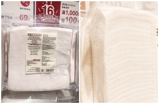 無印良品的原色化妝棉,使用的是長纖維棉花不經漂白直接使用,製成觸感極為柔軟且多用途之化妝棉,使用過一次就會被這棉柔感所吸引,且有推出大判尺寸,很適合拿來濕敷。夾鍊袋的包裝設計,能夠保持清潔衛生,且有不佔空間,這款化妝棉是無印控的回購霸主。