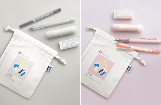 日本文具蜻蜓牌TOMBOW於8/17全新推出「MONO Smoky」 莫蘭迪色限定款(圖左),台灣獨家推出束口袋組合包(圖右)l誠品書店