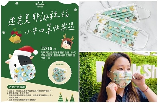 讓迷客夏陪伴您安心度過美好聖誕節!2020/12/18(五) 起到門市單筆購買迷客夏飲品滿額$150元以上 (須至少乙杯含手感芋圓鮮奶系列新品或加芋圓配料),即贈限量迷客夏聖誕手繪風三層防護口罩乙只 ( 注意事項:適用可加料飲品系列,不累計,僅限現場自取,全台口罩限量70,000片,送完為止)