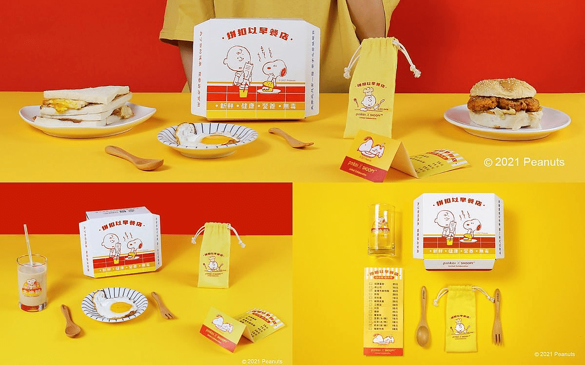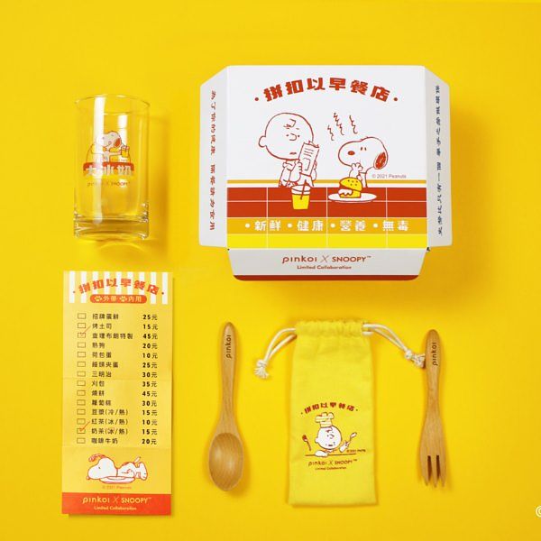 說到吃早餐你會想到什麼?Pinkoi從在地文化出發,結合台式早餐店必點的大冰奶、吐司夾蛋、卡啦雞腿堡,推出Pinkoi自製商品SNOOPY Meets Local 台味日常第二彈,帶領著Peanuts 角色走進台灣人的生活,細細品嚐藏在細節處的美好台味日常,從打開早餐盒的那一刻開始。Pinkoi從商品到包裝帶給大家濃濃台式風情,選用最道地的台式早餐店紅黃配色配上查理布朗與Snoopy可愛早餐圖,打造獨家大冰奶玻璃杯、木製餐具及收納束口袋,更精心設計包裝,向「台式經典早餐紙盒設計」及古早味「早餐店菜單」致敬。