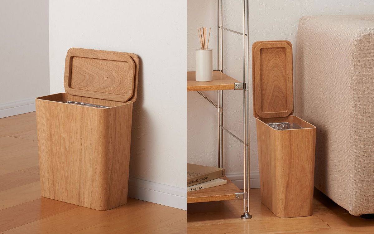 全白的房間點綴一點木質小物,立刻讓空間變得溫馨又時髦,這款垃圾桶使用木紋美觀的橡木材薄片加工成省空間的長方形,完全不占空間,另售的蓋子能從四邊打開。