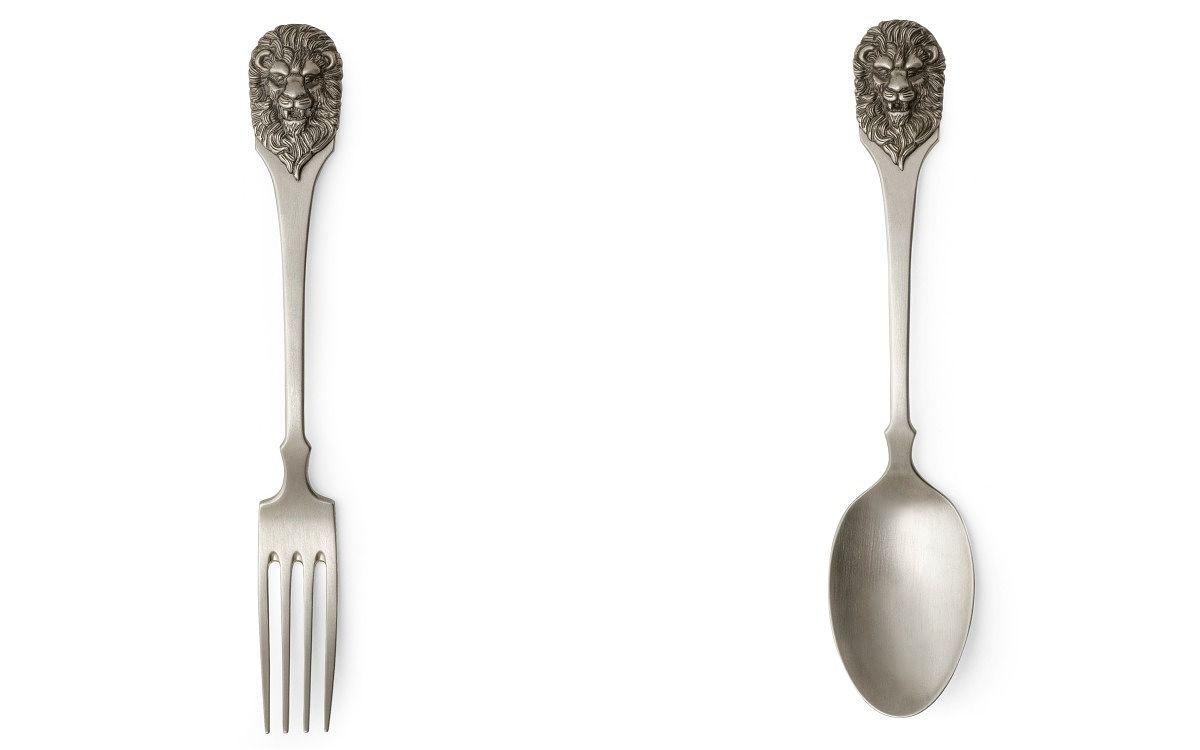 在 2021 Gucci Décor 新系列所呈現的眾多新穎概念中,創意總監 Alessandro Michele 以裝飾考究的餐具來滿足眾多家庭所重視的社交餐飲體驗。新款餐具包含具古董風格的成套鍍銀叉子與湯匙,握柄上的獅子頭像呼應常見於Gucci 珠寶中的經典元素,獅頭背面則提供預先訂製名字縮寫的客製化服務。每一件餐具都經過 20 道以上的繁複鑄造工序,獨特的獅頭更是以手工敲鑿修飾而成。這組精巧成套餐具包裝上採用綢緞軟盒繫上黑色蝴蝶結,或可選擇綢緞內裡的黑色環保皮盒包裝。