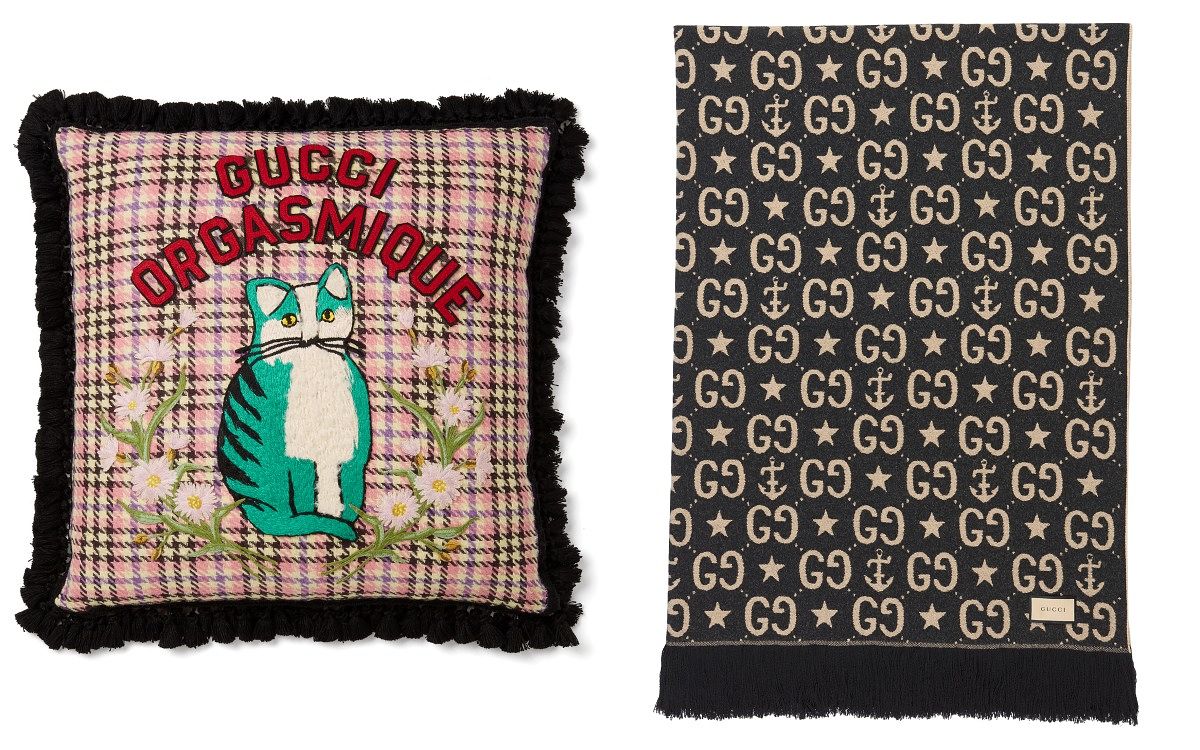 Gucci Décor 的毛毯與靠枕皆具寧靜放鬆的觸感,新款毛毯上的星星、GG Logo 與船錨圖案是以精紗線製作,搭配手工流蘇細節;搶眼的靠枕以刺繡拼貼呈現 Gucci 主題中的貓科動物,搭配華麗的流蘇滾邊,將近耗費達 5 小時的工時才能製作完成。此細心呈現品牌獨特裝飾美學,既是一場視覺的饗宴,也是舒適與溫馨的來源。