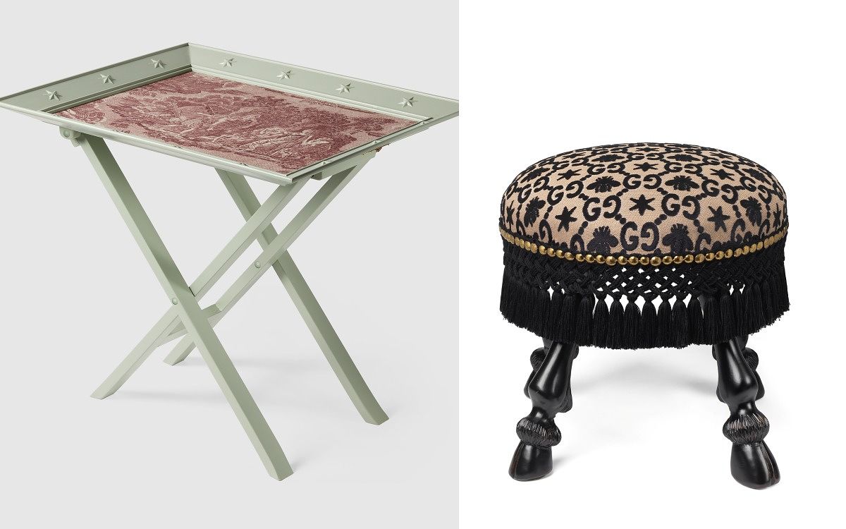 Alessandro Michele 相信家俱象徵個人獨特的空間美學,而 Gucci Décor 的桌椅都別具個性。新款沙發凳提供不同大小的訂製尺寸。經典的 GG 蜜蜂與星星主題緹花面料,搭配古舊黑檀木製作的動物造型椅腳,別具神秘的異國風情;托盤折疊桌採用溫柔淺綠色木質為骨架,表面的薄麻帆布上飾有繁複華美的“Gucci L'Aveuglé Par Amour”印花畫作,意即”為愛盲目”,傳達了 Gucci 多個系列所推崇的浪漫主義情懷。同時為了滿足引人注目和令人難忘的空間布置需求,Gucci Décor 取材自品牌廣大的印花收藏,設計了以花卉與幾何為主題的新款壁紙,提供家居布置中更多繽紛的選擇。